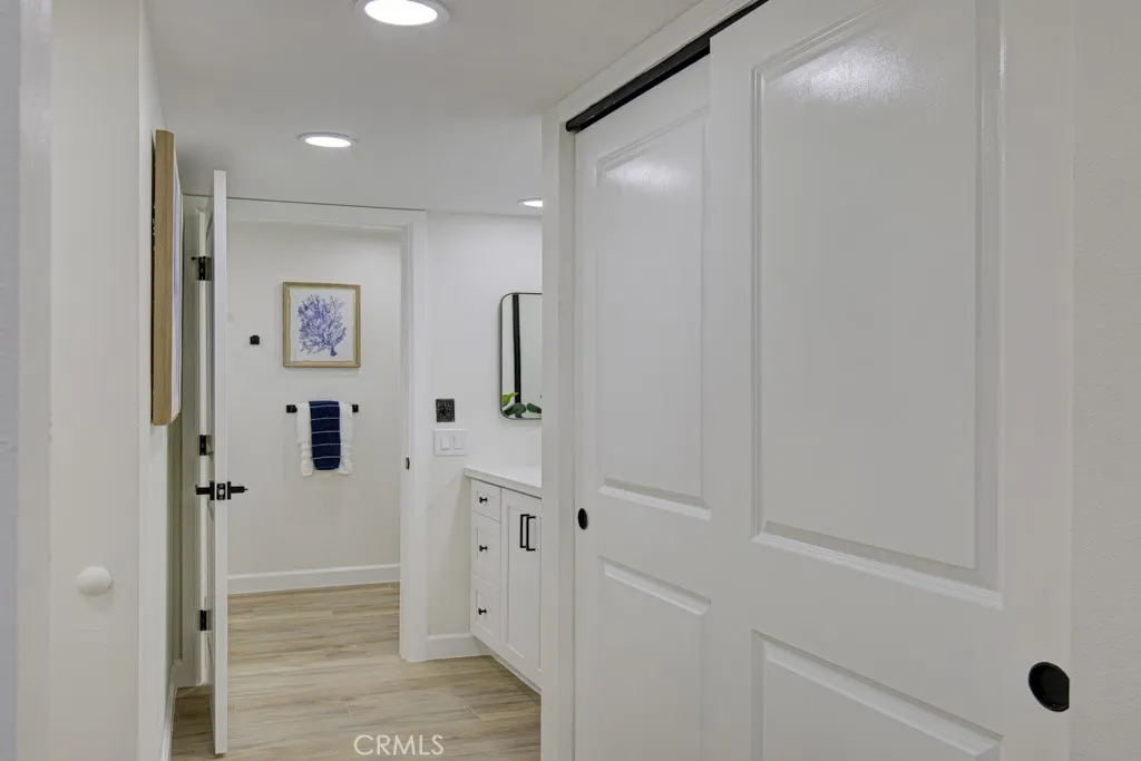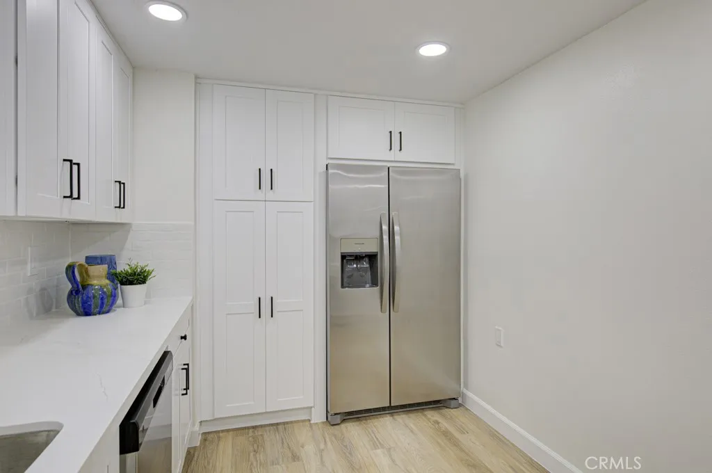 Welcome to 5499-2D Paseo Del Lago West a newly remodeled two-bedroom, two-bath, end-unit EL MIRADOR residence in the Laguna Woods senior community. Beyond a wrought-iron gate, double front doors open to a small entry foyer and the common rooms beyond. The enormous living room easily accommodates multiple configurations of large furnishings. The kitchen has brand new cabinetry (with lazy susan, spice drawer, built-in trash/recycling drawer and soft-close doors and drawers) and quartz countertops. The stainless-steel appliances are also brand new. The primary bedroom has a full wall of closet space with sliding glass doors. The primary bathroom has a tub/shower combo. The versatile guest bedroom could also serve as a home office, workout/yoga room or arts and crafts studio. The guest bedrooms window has a lovely view of endless trees and the Saddleback Mountains in the distance. The guest bathroom has a stall shower. The primary and guest bedrooms are at opposite ends of the residence affording increased privacy between the rooms. This home has been beautifully upgraded throughout. Features include smooth ceilings, recessed lighting throughout (all on dimmers), dual-pane windows and sliders and attractive vinyl plank flooring. The open covered balcony (accessible via a glass slider in the dining area) is ideal for year-round outdoor entertaining, dining and relaxing with friends and family. Convenient elevator access from the assigned parking space (with additional cabinet storage) in the subterranean garage to your front door. Common laundry facilities are available nearby.