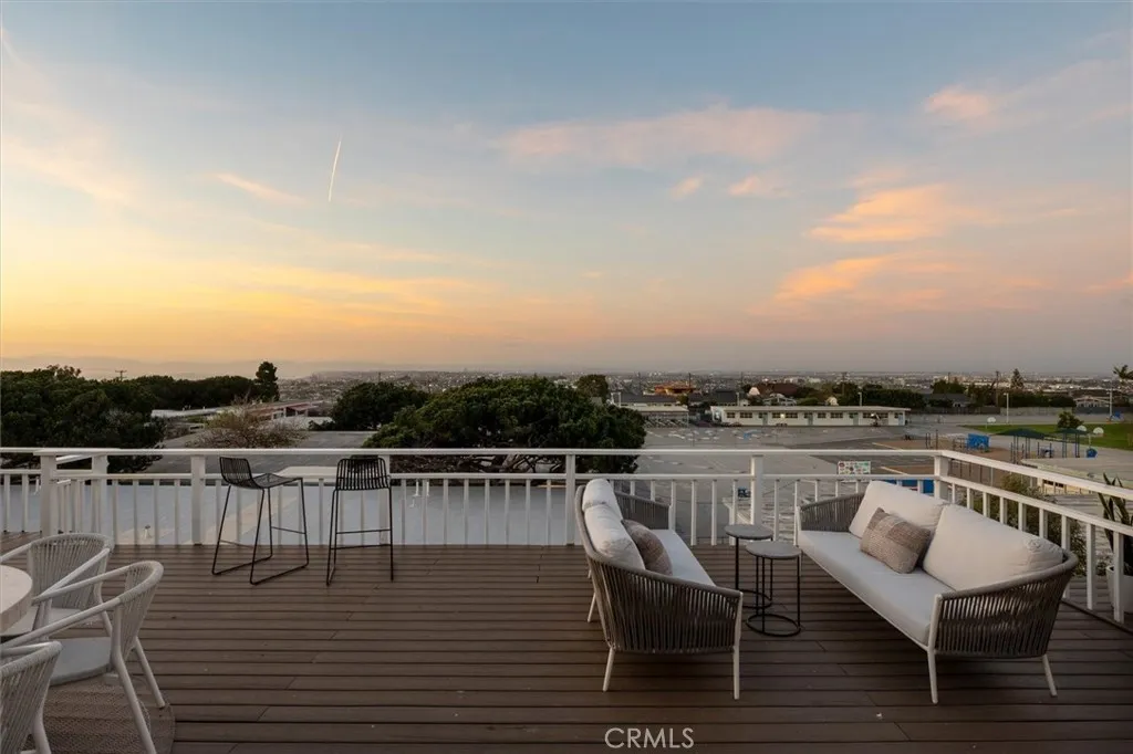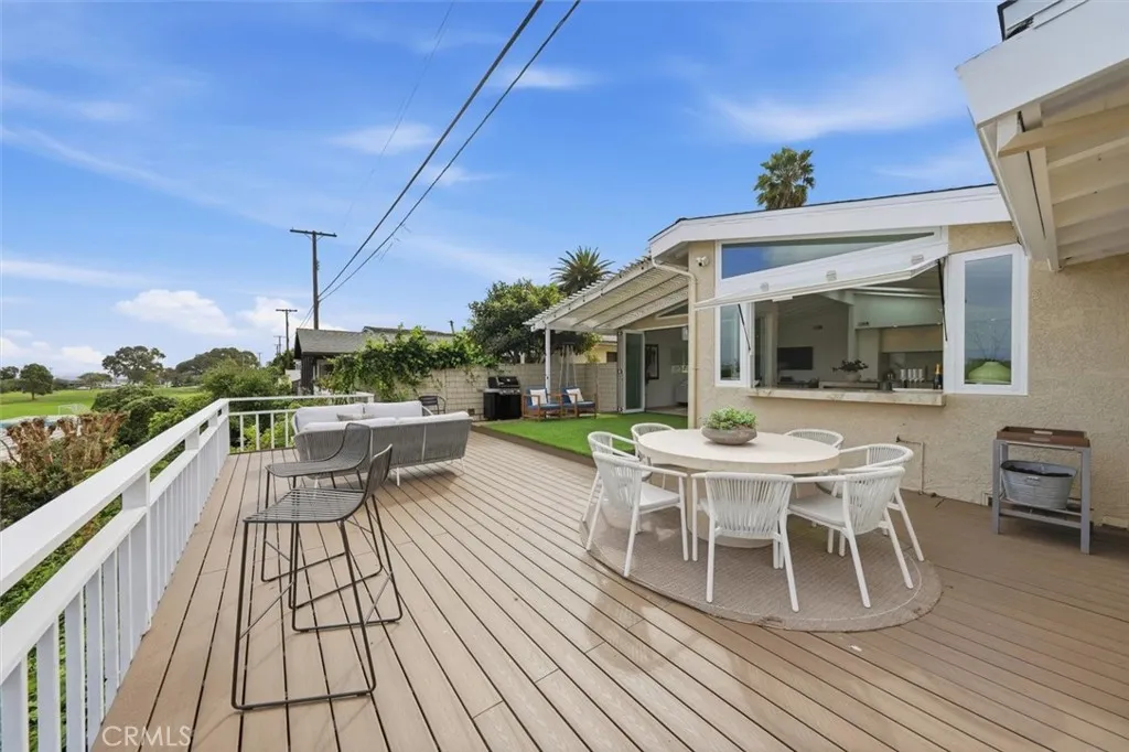 Set on a single level in the Riviera, this home has been beautifully remodeled with a refined, modern aesthetic and sweeping mountain, city and ocean views. Enter through steel 8-foot Pinkys double doors into a welcoming foyer with a live ficus and engineered hardwood floors that run throughout the home. The dramatic main living area has vaulted ceilings and an effortless indoor-outdoor connection. An accordion glass door opens wide to a 1,100-square-foot composite deck, designed with multiple seating areas to take in the incredible views. Lighted stairs and smart-home exterior lighting elevate the outdoor experience, while dual-zone wired speakers extend seamlessly from the interior to the deck for easy entertaining. At the center of it all is a stunning kitchen anchored by a massive island topped in premium Taj Mahal quartzite, seating for barstools, prep sink and a beverage refrigerator. Other nice details such as soft accent lighting, Bosch appliances and a Bertazzoni range with brass burners create a kitchen that is equal parts sleek and functional. Adjacent to the kitchen, the formal dining area is positioned beside an oversized custom window that opens directly to the outdoor bar, creating a seamless pass-through for entertaining. A butlers pantry adds convenience with its own sink and built-in wine and beverage refrigerator. Taj Mahal quartzite continues throughout the indoor-outdoor bar, butlers pantry and primary bath, tying the spaces together with a cohesive and luxurious finish. Two secondary bedrooms share a bath with a floating vanity, tiled walls, custom map