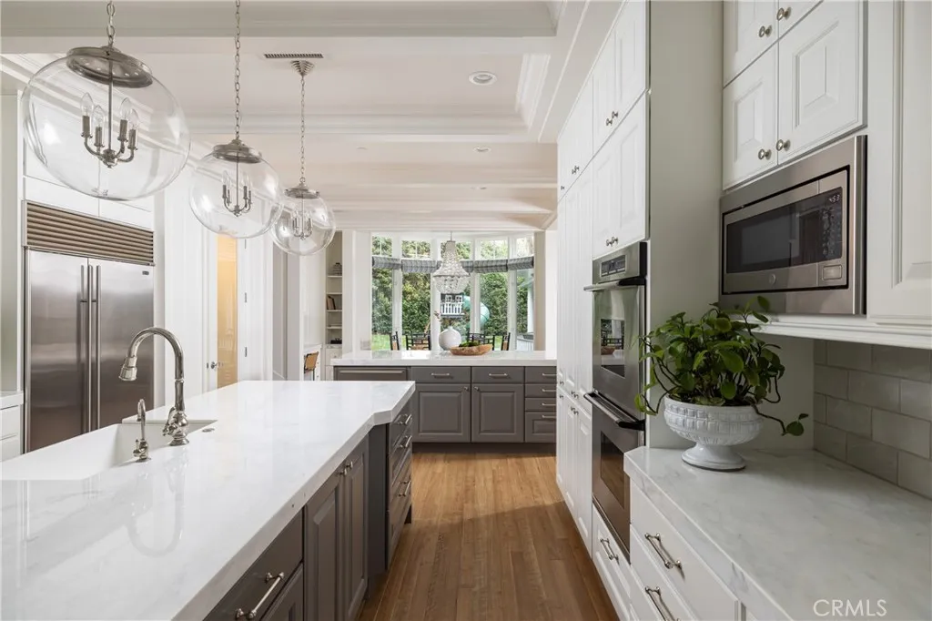 Welcome to this stunning custom estate in the prestigious Big Canyon community of Newport Beach, where exceptional curb appeal meets unmatched luxury living. This dream residence boasts eight spacious bedrooms, six full baths, and two half baths. Enter through the grand two-story foyer into expansive living and dining areas, a family room, and an unparalleled chefs kitchen featuring exquisite imported Italian marbletruly an epicurean masterpiece. The kitchen is a dream, complete with a large Marble Island and countertops, Subzero refrigerator, top of the line Viking appliances: 6-burner stove and griddle, wine cooler, two ovens, two Miele dishwashers, cooling drawers, and premium polished nickel Waterstone and Rohl fixtures. The home includes a butler's kitchen with stove, ice maker, two warming drawers, wine cellar, and a versatile office/craft room. Enjoy serene views of the private, lush green yard from nearly every room, creating a true sanctuary of relaxation. The expansive primary suite is a true retreat, providing an opulent escape for rest and serenity. It features a dream closet, and a spa-like bathroom adorned with top-quality marble and tile, complemented by a stunning bathtub imported from Italy. Every detail is meticulously crafted, including solid nickel faucets, adding a touch of elegance and refinement to this exquisite space. Conveniently located just outside the primary bedroom is a study ideal for productivity or unwinding. The second wing offers five private bedroom suites, complete with its own family room, bar, and game area, providing ample space for