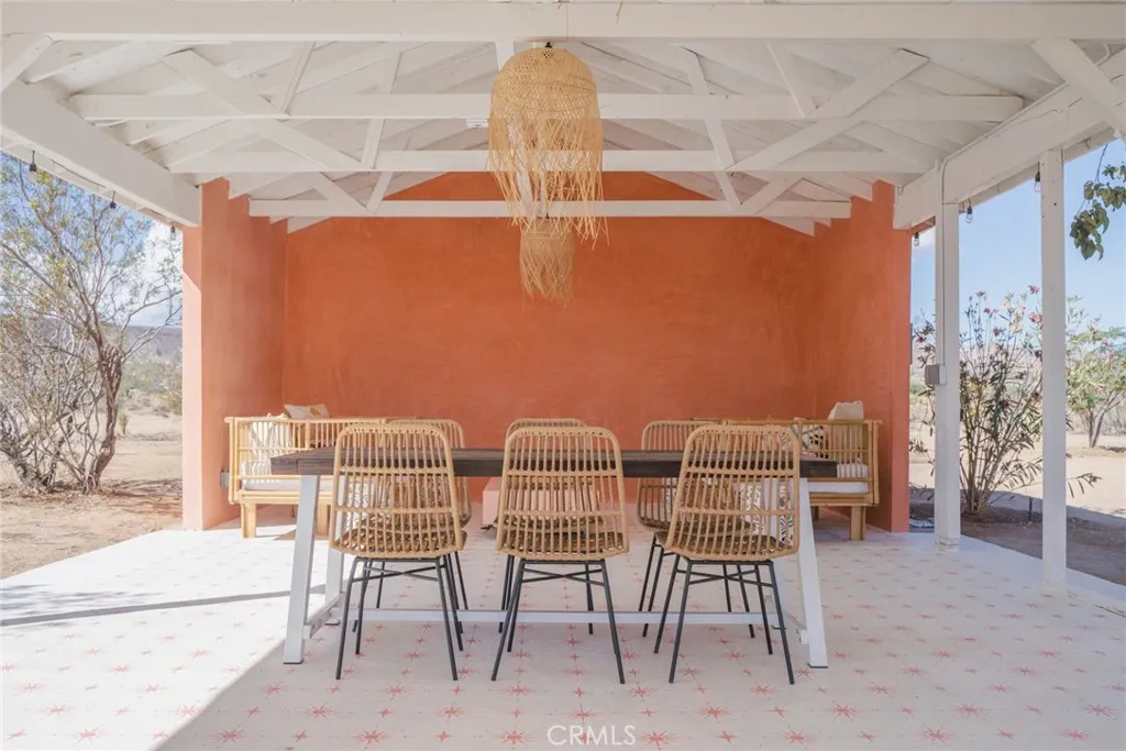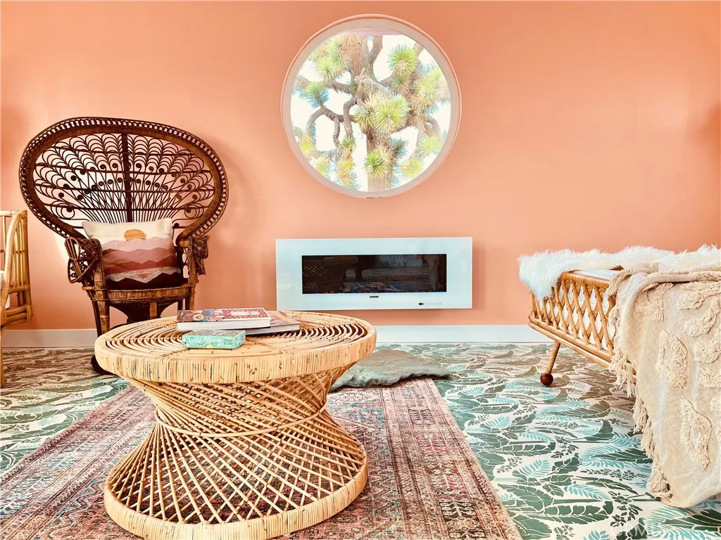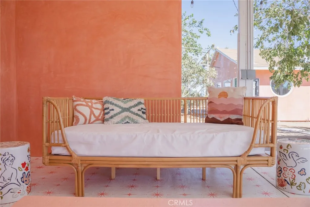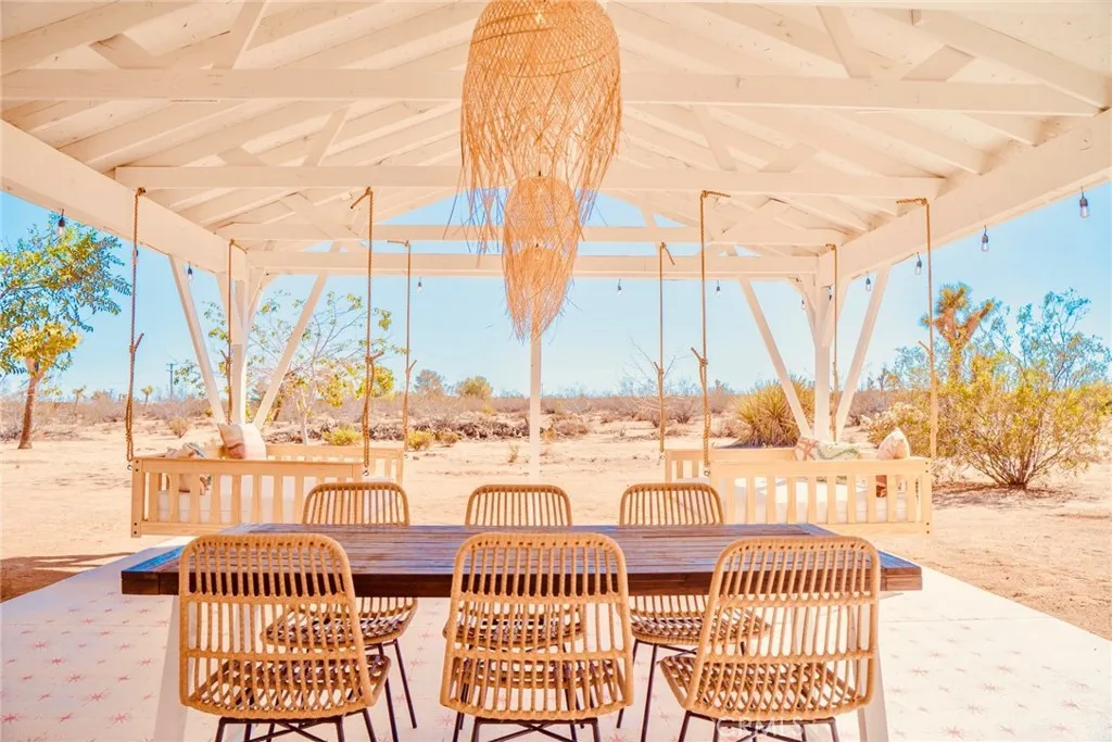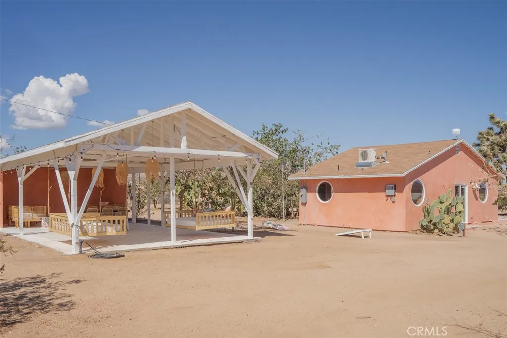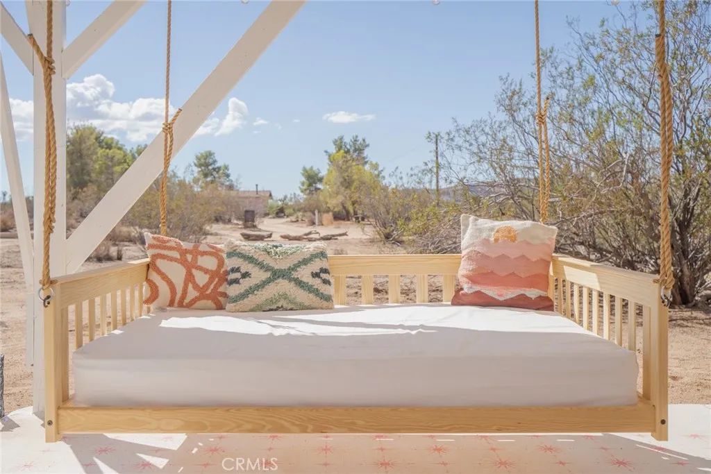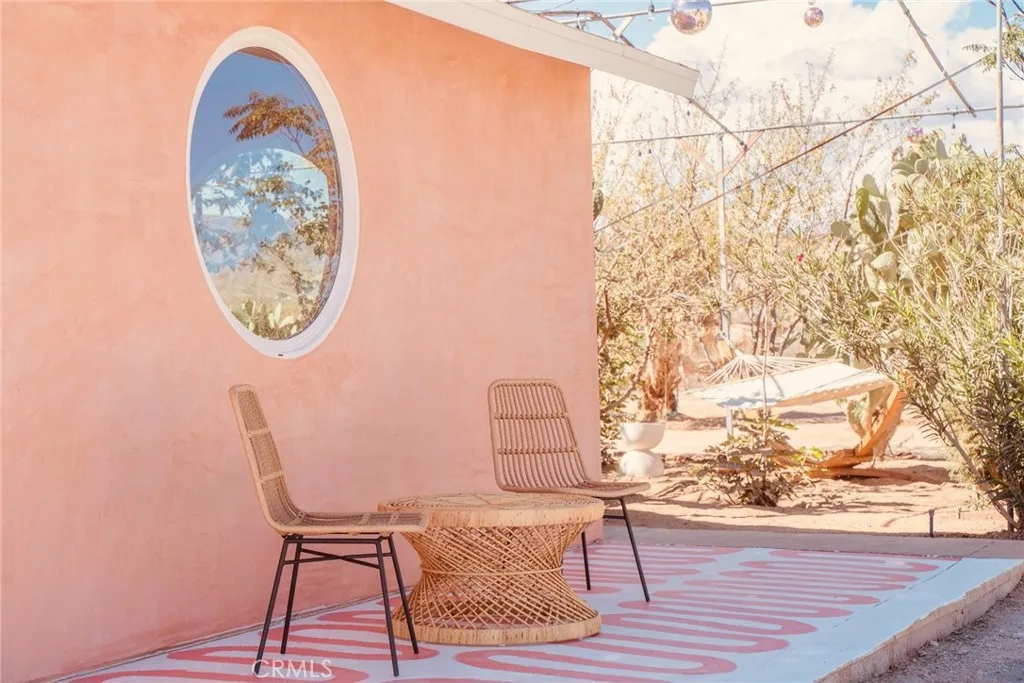 *** Price Drop! *** Looking for a unique, turnkey property, with a strong Airbnb history, covered with Joshua Trees with park like views? Look no further! Coral and Cacti Jungalow is stunningly beautiful property on 5 acres, with windows galore and a coral pizza oven that is wildly popular with guests! The colorful jewel is a guest favorite with hand painted floors, an oversized patio with hanging beds, a luxury cement fire pit with epic sweeping views to the east. Enjoy candy colored sunsets or hot tub under the stars! This property has an upgraded electric panel and sub panel on the detached patio for possible expansion as well as an EV charger. All work here was fully permitted! Property can be sold furnished with Anthropology, World Market and Pottery Barn lights, furniture and beds. With rustic hand painted floors, a custom plaster double shower, glass panels and a beach front shower with beautiful colors; this is a one of a kind property will be a hit with your bohemian color lover! Its originality helps it stand out from the crowd and has historically brought in consistent revenue year round. And yes, it has all the amenities you'd expect for a turnkey short term rental: hammocks, outdoor shower, cowboy pool, security cameras, hand painted corn hole boards, butcher-block counters and an oversized fridge for entertaining. The vibes views here are fantastic and the views are immaculate! The lot directly south east is government land which means these views will likley stay unobstructed. The land extends 4 acres east giving privacy for strategically placed oversized rou