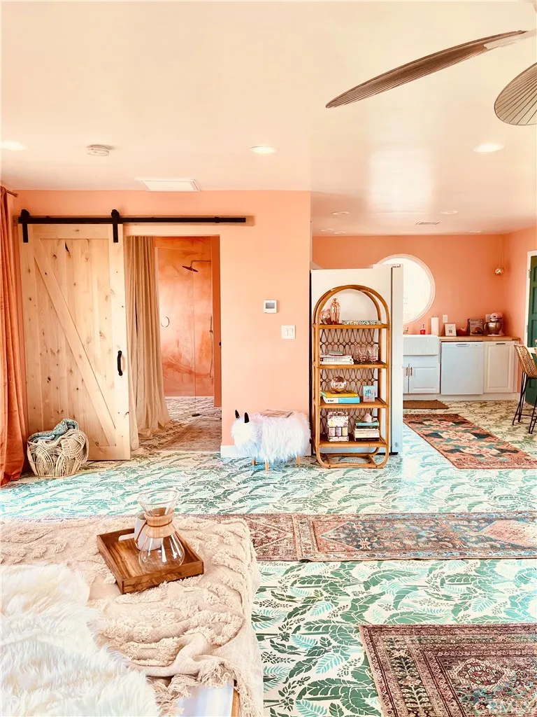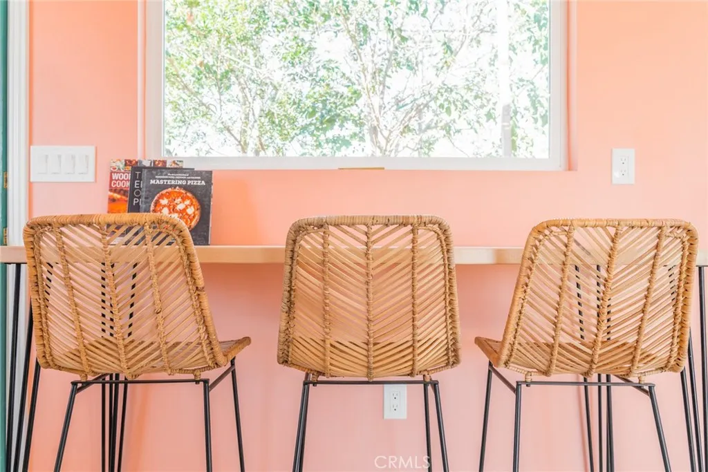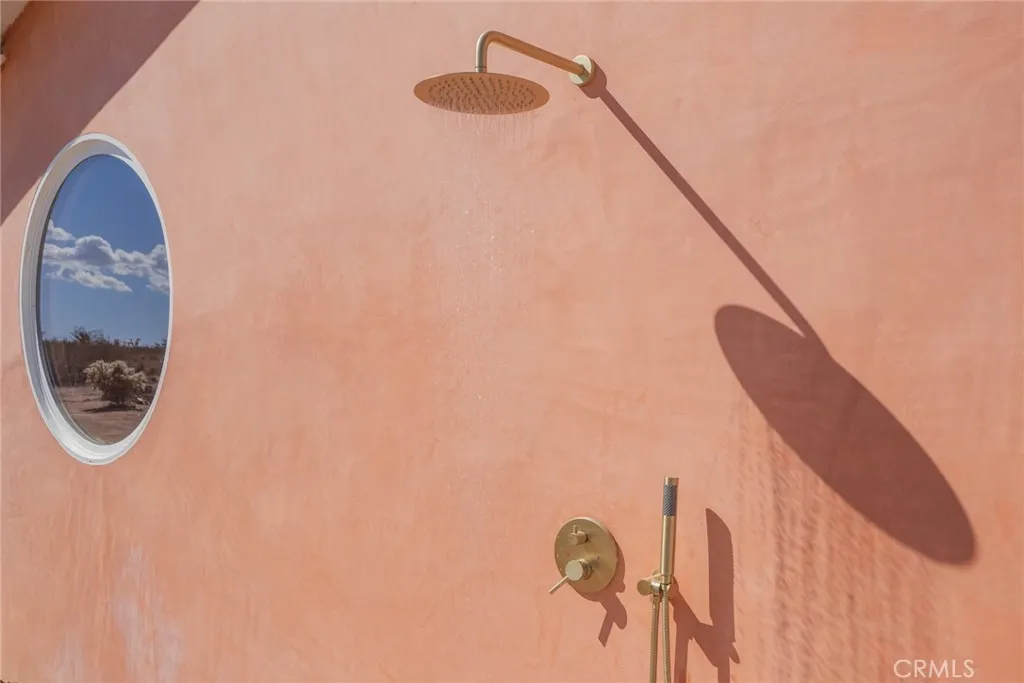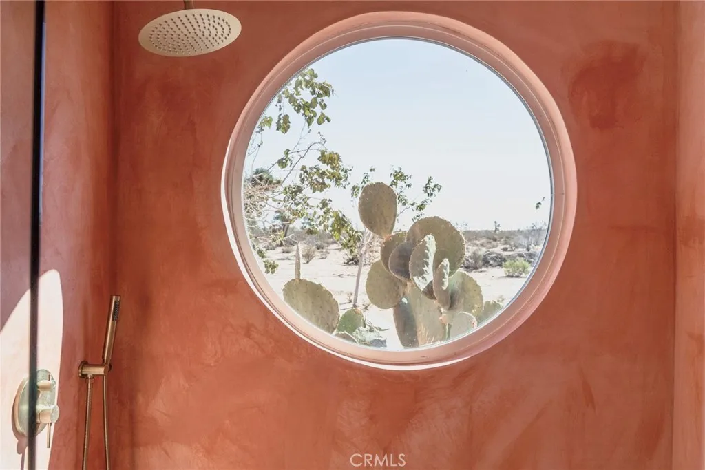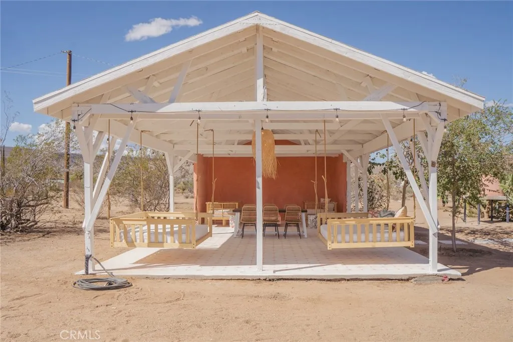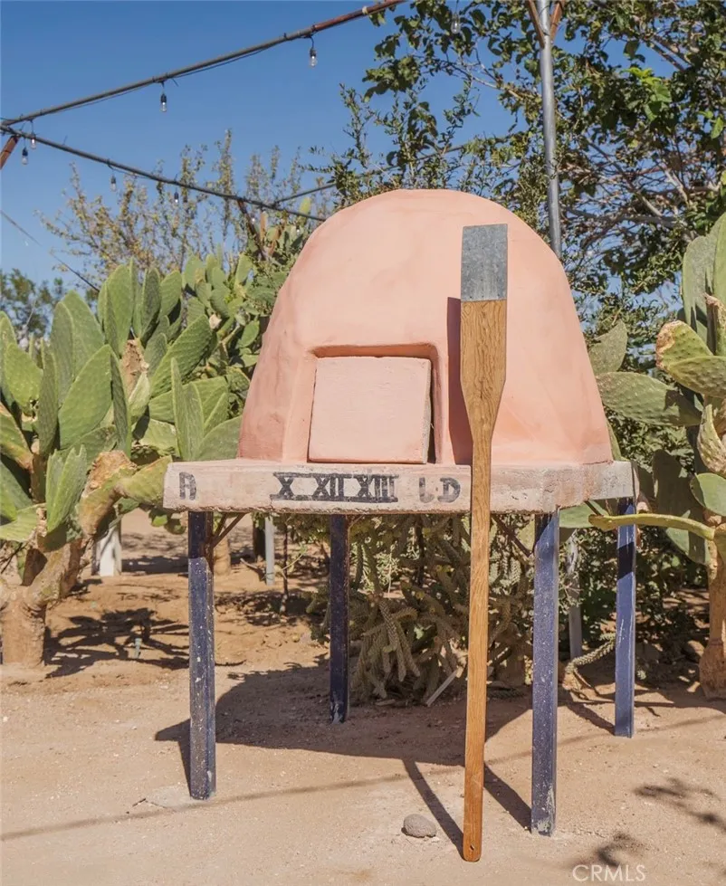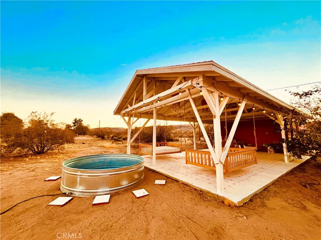 *** Price Drop! *** Looking for a unique, turnkey property, with a strong Airbnb history, covered with Joshua Trees with park like views? Look no further! Coral and Cacti Jungalow is stunningly beautiful property on 5 acres, with windows galore and a coral pizza oven that is wildly popular with guests! The colorful jewel is a guest favorite with hand painted floors, an oversized patio with hanging beds, a luxury cement fire pit with epic sweeping views to the east. Enjoy candy colored sunsets or hot tub under the stars! This property has an upgraded electric panel and sub panel on the detached patio for possible expansion as well as an EV charger. All work here was fully permitted! Property can be sold furnished with Anthropology, World Market and Pottery Barn lights, furniture and beds. With rustic hand painted floors, a custom plaster double shower, glass panels and a beach front shower with beautiful colors; this is a one of a kind property will be a hit with your bohemian color lover! Its originality helps it stand out from the crowd and has historically brought in consistent revenue year round. And yes, it has all the amenities you'd expect for a turnkey short term rental: hammocks, outdoor shower, cowboy pool, security cameras, hand painted corn hole boards, butcher-block counters and an oversized fridge for entertaining. The vibes views here are fantastic and the views are immaculate! The lot directly south east is government land which means these views will likley stay unobstructed. The land extends 4 acres east giving privacy for strategically placed oversized rou