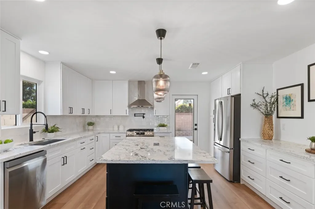 Welcome to this EastGate neighborhood Gem! 5732 Belgrave Ave is a beautifully upgraded home located in the prestigious pocket of West Garden Grove. Renovated with over $180,000 in high-quality improvements, this property offers modern finishes, thoughtful design, and true move-in-ready convenience. The heart of the home features a fully redesigned open-concept kitchen with a large custom island, quartz countertops, soft-closing cabinetry, and top-of-the-line stainless-steel appliances. New luxury vinyl flooring extends throughout the home, complemented by new interior doors, upgraded baseboards, modern fixtures, double-pane windows, and recessed lighting set into freshly scraped ceilings. The living area includes a newly designed fireplace that adds a clean, contemporary focal point. The primary suite has been transformed with a fully customized, expanded walk-in shower featuring premium tile work, a frameless glass enclosure, upgraded fixtures, and a thoughtfully reconfigured layout to maximize space and comfort. This level of detail continues throughout the home, including a tankless water heater, new furnace and air conditioner, ceiling fans in each room, and newly completed landscaping designed for low-maintenance curb appeal. Situated in a desirable interior tract, the home offers convenient access to major freeways while maintaining a peaceful residential feel. As an added benefit, the property is located within a highly regarded, top-rated school systemfurther enhancing its appeal for long-term value and quality of life.