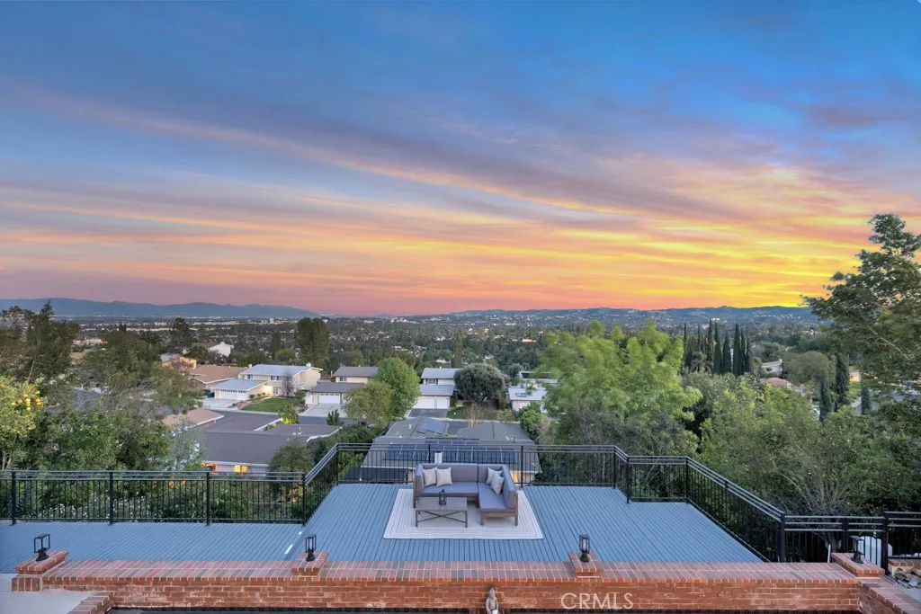 Perched above the San Fernando Valley on one of the most prestigious streets in Woodland Hills, this majestic five-bedroom, four-bathroom estate offers 4,407 square feet of luxurious living space, ideal for high-end family living. Enjoy breathtaking, panoramic jetliner views of the entire valley from virtually every area of the property. Situated on an expansive 13,057-square-foot lot, the residence welcomes you with architectural excellence, featuring soaring vaulted wood-beamed ceilings, crisp lines, and grand open living areas thoughtfully designed to frame the stunning vistas through massive windows. The gourmet chefs kitchen is a true centerpiece, showcasing distinctive dual islands and high-end finishesperfect for both large-scale entertaining and everyday living. The oversized primary suite serves as a private sanctuary, complete with its own viewing balcony that offers a front-row seat to dazzling city lights and spectacular sunrises and sunsets. Step outside to the ultimate California backyard, where a sparkling pool and spa are complemented by a built-in BBQ station and a massive viewing deck with unobstructed 180-degree views. Whether hosting grand gatherings or enjoying the tranquility of the lush grounds, this rare property offers unparalleled scale, privacy, and prestige. Located within a top-tier school district and just minutes from world-class shopping and dining at The Commons at Calabasas and The Village, this legacy estate presents a unique opportunity to own one of the most coveted views in the Valley