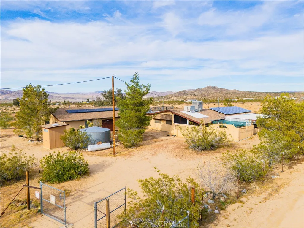 Welcome to Johnson Valley where wide open desert landscapes meet incredible opportunity! This unique property features two homes on one lot plus an impressive 3,500+ sq ft workshop/garage. Ideal for multi-generational living, an income property, or the ultimate desert retreat. There is an additional 2.5 acre lot included totaling 7.548 acres. Main home just under 2,000 sqft has been thoughtfully renovated down to the plumbing and electrical, offering peace of mind and comfort. The spacious kitchen is the heart of the home featuring granite countertops, ample cabinetry, newer Samsung appliances, walk-in pantry, and dedicated laundry room. Versatile bonus room provides endless possibilities perfect for a home office, dining room, creative studio, or additional lounge space. Bedroom offers generous closet space and storage, including a walk-in area with sliding doors leading to the back porch, creating a seamless indoor-outdoor flow. One of the homes standout features is the rooftop deck with safety railing, where you can take in stunning 360 degree desert views and enjoy stargazing under desert skies. Also an enclosed patio area with jacuzzi. Guest home offers about 960 sq ft this includes a attached garage that is insulated to the same standard as the home and could easily be converted into additional living space. Both homes are equipped with solar panels and on-demand water heaters, while the main home also includes a traditional standing water heater for added convenience. What truly sets this property apart is the massive 3,500+ sq ft garage and workshop built by owner,
