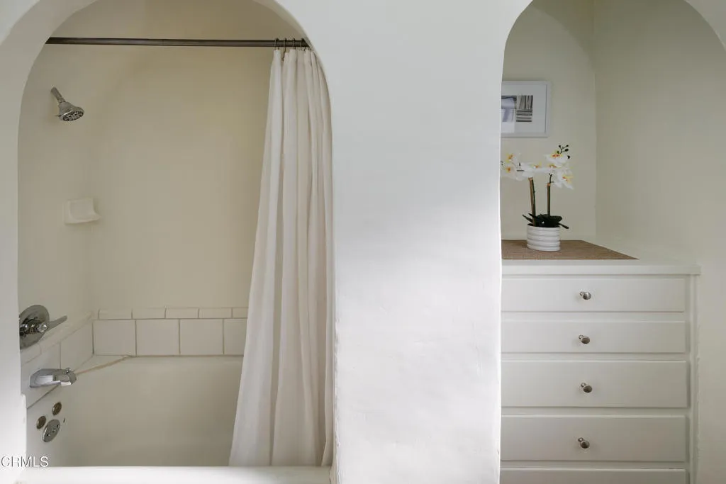 Nestled within a lovely Temple City neighborhood, this enchanting Spanish-style home blends timeless architecture with thoughtful updates. Behind a gated front yard framed by a graceful magnolia tree, a distinctive turret entry welcomes you through a custom rounded front door, setting the tone for the character and warmth found throughout. Inside, the living room showcases a dramatic barrel ceiling, built-in shelving surrounding the classic fireplace, and a ductless mini-split air conditioning system for year-round comfort. Double-hung windows invite soft natural light, highlighting the craftsmanship and charm that define this era. A graceful arched doorway leads to the formal dining area, ideal for gatherings, and continues into the kitchen, where modern touches meet classic design. Quartz countertops, LED lighting, and ample cabinetry provide both style and function. Off the kitchen is a cozy breakfast nook with built-in cabinets and an arched pass-through to the dining room, a perfect spot for morning coffee. Nearby, a utility and laundry room offers additional storage and backyard access. The home's two bedrooms each feature closets with the hallmark vintage windows so characteristic of early California homes. Between them sits a full bathroom with a tub and shower combination, a single-sink vanity with stone countertops, and period-inspired details that honor the home's heritage. Outside, the expansive backyard invites both relaxation and entertaining. A covered patio and outdoor fireplace create a welcoming space for gatherings beneath the shade of a majestic oak tree