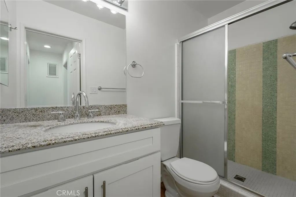 Second floor rear end unit of two-story seven-unit building. Hardwood floors, granite counters, stainless stove and dishwasher, smooth ceilings, gas fireplace, a/c, energy-efficient LED recessed lighting throughout, two balconies, new paint throughout, professionally cleaned, and ready to move in. Building has coin-op laundry room. Covered parking available ($5/m). $3295/m base rent, less $1000/m discount with 12 month lease.