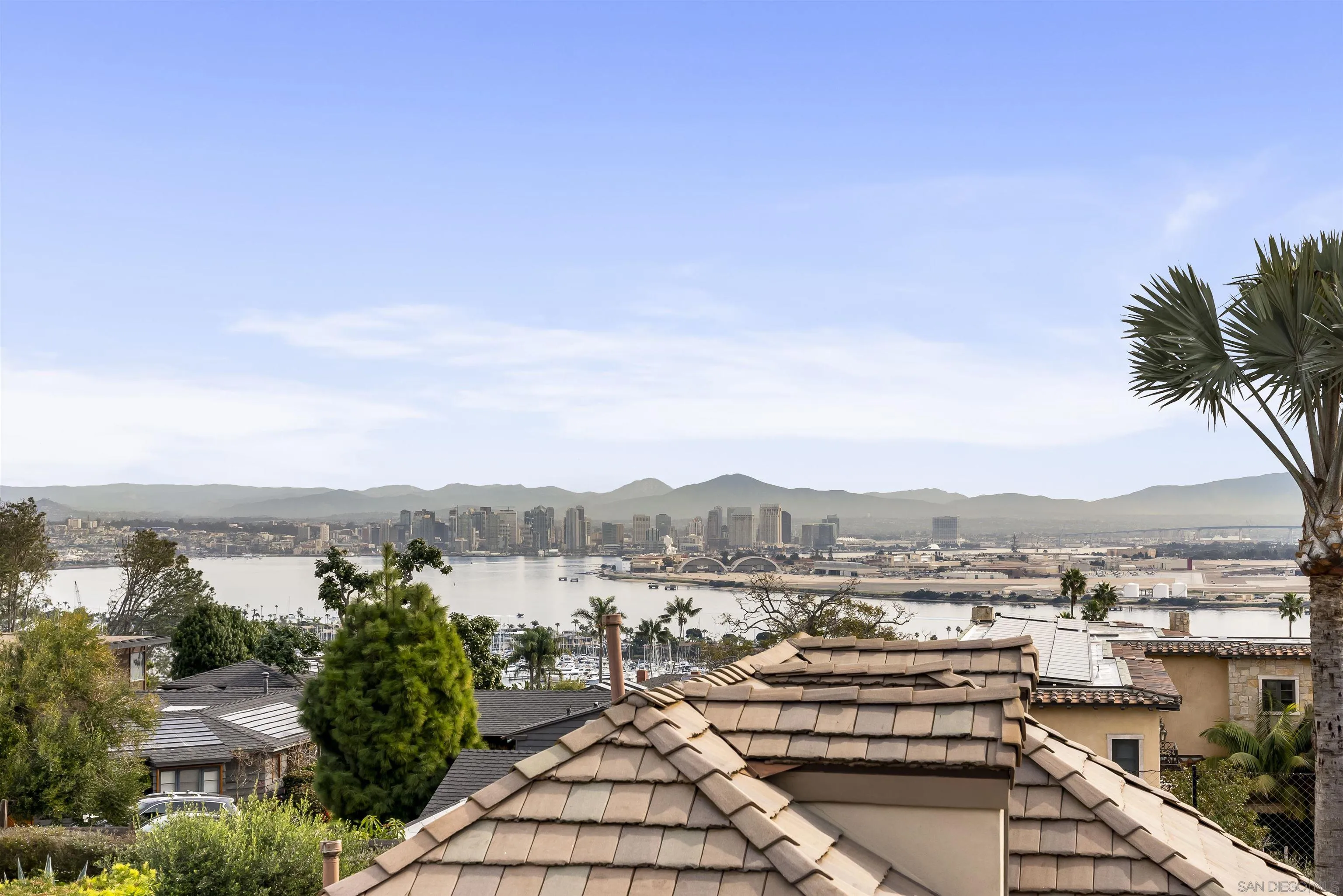 Elevated on a prestigious, quiet street, this bespoke residence sits on a rare ½-acre lot capturing sweeping panoramic views of Coronado, San Diego Bay, and the downtown skyline. The home is designed for entertaining, featuring a dramatic double-height living room, curved staircase, and a modern chef’s kitchen with custom quartz countertops. The resort-style grounds are exceptional, terracing down the oversized backyard to reveal a complete resort experience: an outdoor BBQ & Bar, waterfall pool & spa, fire features, putting green, and a sport court (pickleball ready). Multiple lounge areas overlook these amenities, creating the ultimate private retreat. The property includes a detached ~700 SqFt 2-bedroom guest house (ideal ADU, office, or gym combination), a 3-car garage with Tesla charging, and solar. Two gated entrances ensure privacy and ample parking. The oversized primary suite features a fireplace, expansive bathroom, and stunning views. A must-see value for the neighborhood.