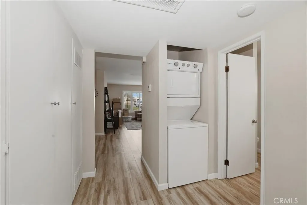 Enjoy comfortable single-story living in the established Sunrise Village 55+ Community. This 2-bedroom, 2-bath home offers a bright, functional layout designed for easy, low-maintenance living. Situated in a desirable end-unit location, the home shares only one direct neighboring residence, offering added privacy along with a pleasant courtyard view. The main living areas feature porcelain tile flooring with a wood-grain finish, plantation-style shutters, and abundant natural light. Both bedrooms include soft carpet for added comfort and sliding glass doors that open directly to the private patio. The patio provides outdoor space and includes a storage shed, offering convenient room for tools, seasonal items, or extra storage. Additional features include in-unit stackable laundry, ample interior storage, and two assigned carport parking spaces. Residents of Sunrise Village enjoy access to community amenities including a pool, spa, shuffleboard area, courtyard, and clubhouse, while the HOA covers water, trash, and landscaping. Conveniently located near shopping, dining, medical services, and everyday essentials, this home offers a comfortable setting within a well-established 55+ community.