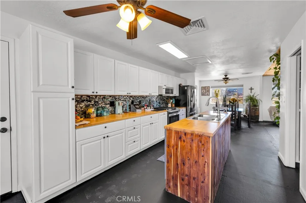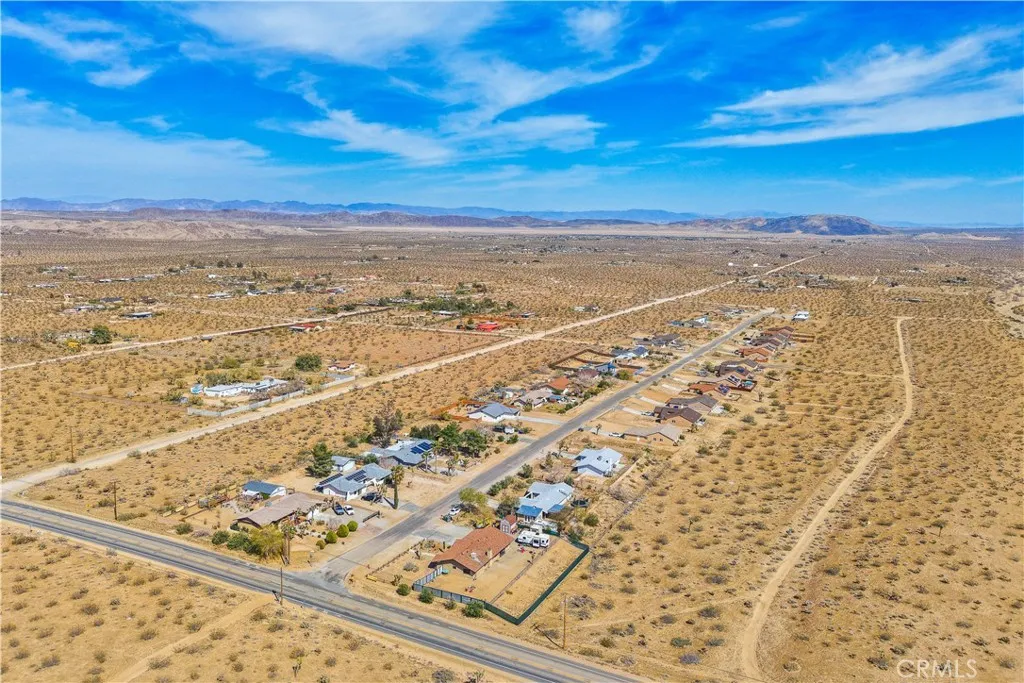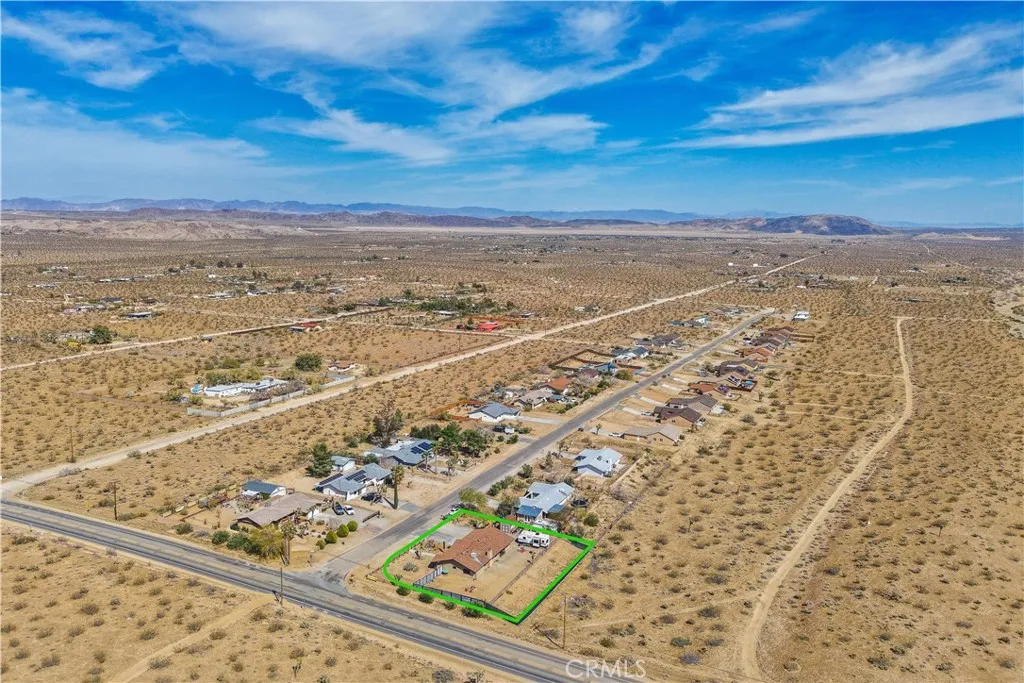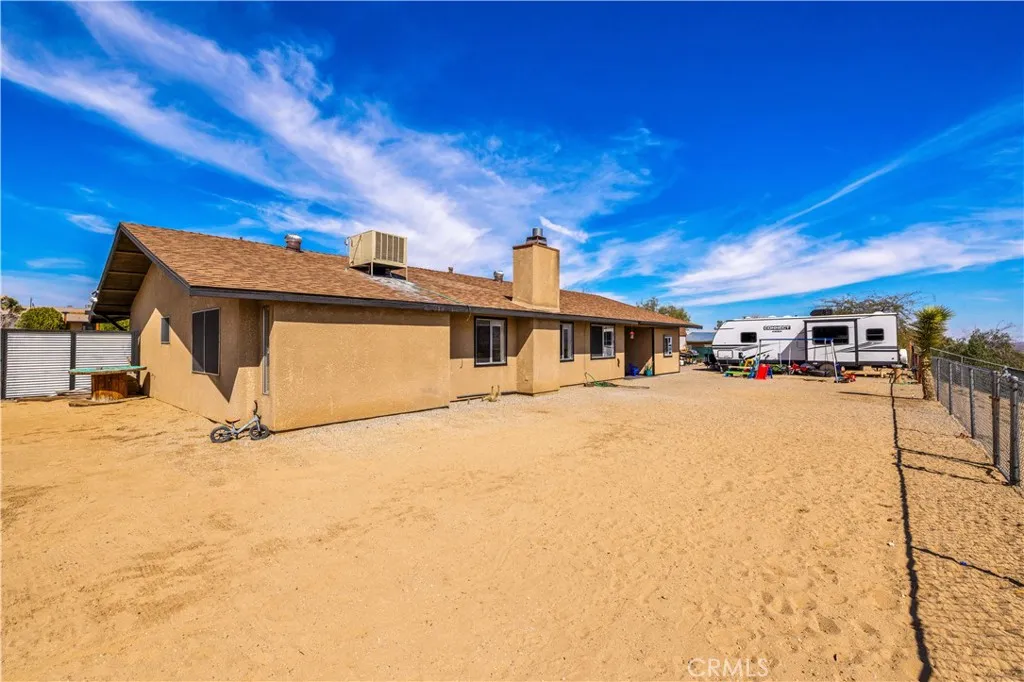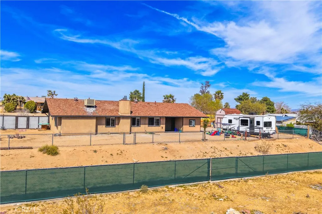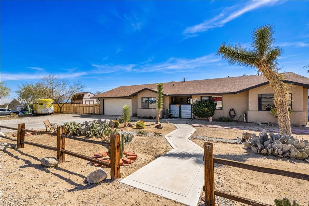 This spacious 3-bedroom, 2-bath home sits on a large corner lot and offers incredible views of the surrounding mountains near Joshua Tree National Park. As you approach the property, youll appreciate the mature desert landscaping and the abundance of parking. A concrete driveway leads to the attached two-car garage, while a side yard with a drive-through gate provides convenient RV parking with hookups along with plenty of additional space for trailers, vehicles, or desert toys. Before entering the home, youll pass through a gated front entry that creates a private courtyard, perfect for enjoying a quiet cup of coffee in the morning. Inside, the home welcomes you with beautiful vaulted tongue-and-groove ceilings in the living room and large banks of windows that bring in natural light and showcase the stunning mountain views. The open floor plan allows the living room to flow seamlessly into the dining area and kitchen, creating a comfortable and functional layout for everyday living and entertaining. The remodeled kitchen features butcher block countertops, a stylish backsplash, stainless steel appliances, and an island, along with an office desk space just off the kitchen. Nearby, a multipurpose room serves as both the laundry area and additional pantry or storage space. The primary bedroom is generously sized and offers ample closet storage. The ensuite bathroom has been remodeled and includes a new vanity and a stylish walk-in shower. The two additional bedrooms are both spacious, and the conveniently located guest bathroom has also been updated and features a shower-tu