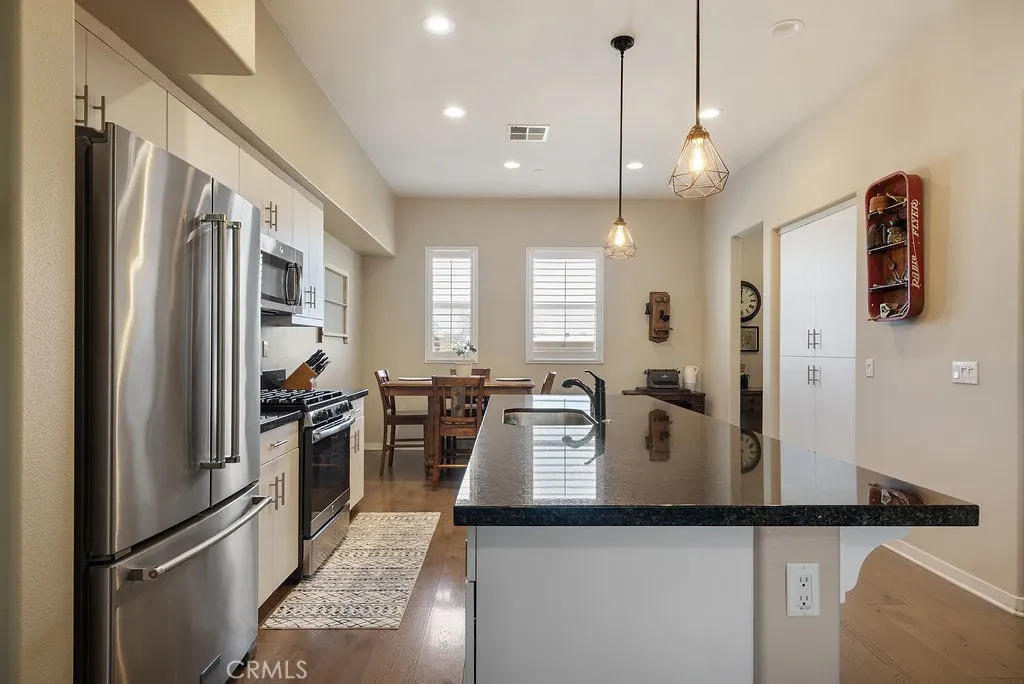 Built in 2017 and impeccably maintained, this contemporary multi-level townhome offers comfort, style, and breathtaking views of the San Gabriel Mountains. Thoughtfully designed by the builder to maximize light and scenery, the community showcases timeless modern architecture youll love. The first level features direct garage access and a versatile room ideal for a home office or additional bedroom, complete with a private patio, ADA-compliant full bathroom, custom shades, and ample flexibility. The second level opens to a bright and airy living space anchored by a sleek modern kitchen with stainless steel appliances, white cabinetry, and elegant stone granite countertops. A spacious pantry offers additional storage or the perfect spot for a custom coffee station. Step out onto the living room balcony to enjoy your morning coffee with peaceful community views. A convenient guest bathroom on this level makes entertaining easy.Upstairs, the third level boasts two generously sized primary suites, each featuring deep walk-in closets, double-sink vanities, and beautiful mountain views. A dedicated laundry room with storage sits conveniently between the suites. Natural light fills every level, enhancing the open layout. Custom plantation shutters accent the windows, complementing the rich wood flooring and light-colored carpeting throughout. Residents enjoy resort-style amenities including a community pool and BBQ areas, all while being just minutes from Target, shopping, dining, the mall, and quick access to the 10 and 210 freeways.