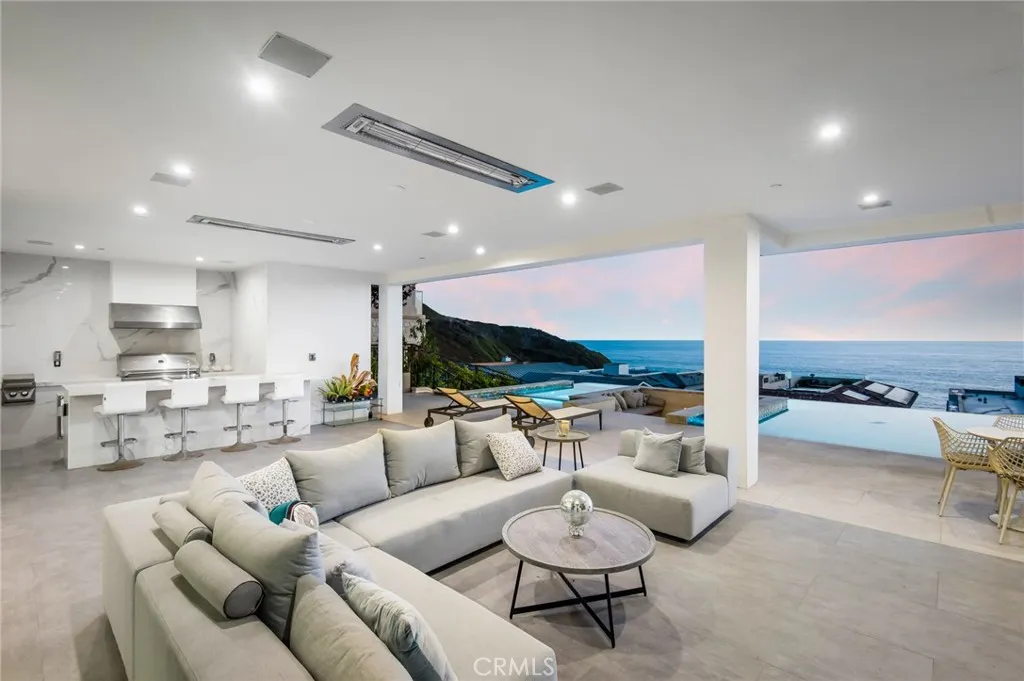 Recently constructed contemporary masterpiece in The Strand at Headlands - a coveted enclave located along the awe-inspiring Dana Point coastline. Sited behind the guard gates, the residence offers nearly 7,400 square feet of immaculately appointed, sleek interiors with an awe-inspiring exterior space, complete with one of the largest pools in the community. The straight-on views of the Pacific and Catalina Island begin at the entryway into this property, with its main level framed by two sets of full-height sliding glass doors spanning the length of the ocean-facing wall. Thoughtfully designed and executed, this floor offers the best in open entertaining space, with a glassed-in wine feature, living and dining areas, an office, and the home's impressive kitchen. Anchored by a bookmatched waterfall edge peninsula large enough to seat six, it boasts a cooktop and built-in coffee machine by Gaggengau, as well as a suite of Bosch appliances. Discreetly hidden, a large walk-in pantry maximizes the storage. Capitalizing on the views, the large balcony offers secondary dining and lounging areas. A modern floating staircase connects all three stories, with the upstairs dedicated to sleeping quarters. The soothing views of the Pacific extend to the primary retreat, complete with a balcony, a fireplace, and a sitting area. An expansive bathroom with a standalone ocean-facing tub, an oversized shower, and dual walk-in closets enhance the luxury of the owner's suite. Accessible by stairs and the home's elevator, the lowest level is the ultimate in California entertaining, with an impr