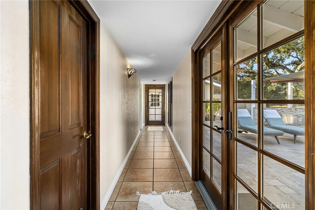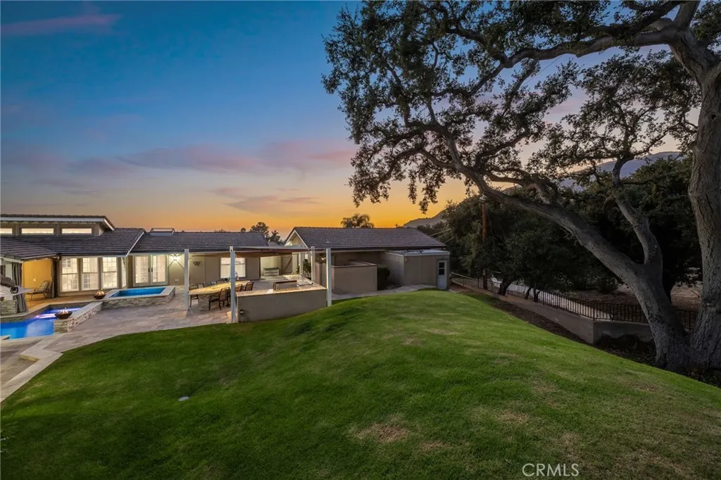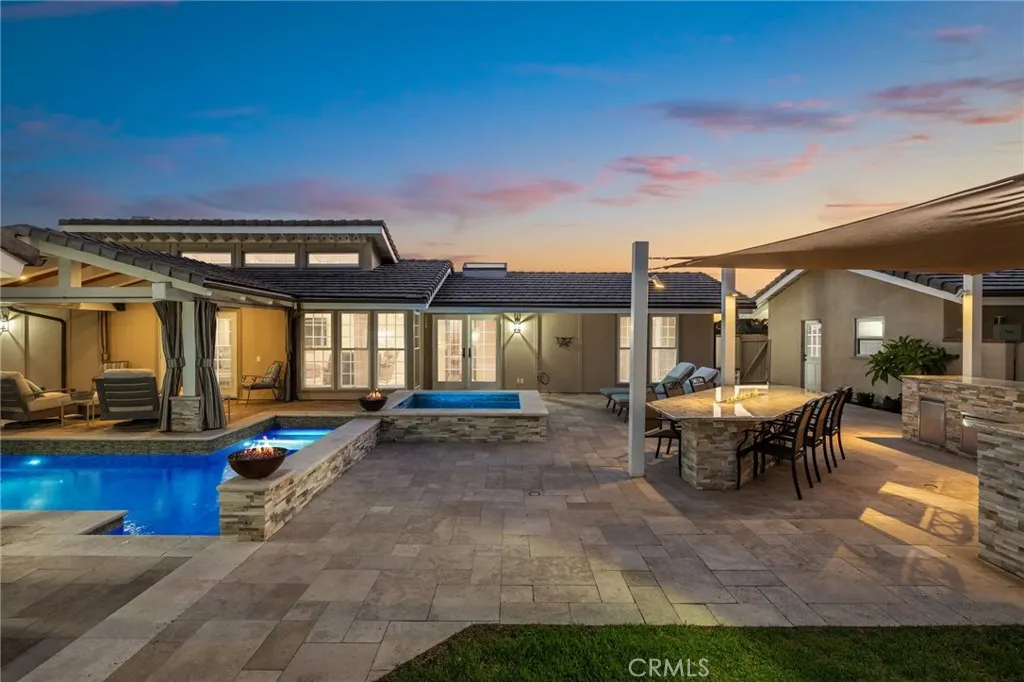 Custom California Ranch-Style Estate featuring a symmetrical faade, circular paver driveway, stacked-stone accents, and meticulous landscaping. Double iron-and-glass entry doors opens to a light-filled interior framed by floor-to-ceiling windows and wood-trimmed architectural columns, leading seamlessly into the formal living and dining rooms. The living room offers a tray ceiling with crown molding, a fireplace, and windows overlooking the front yard. The dining room offers a mirrored coffered ceiling and French doors that open to a front sitting area. The kitchen features custom wood cabinetry, granite countertops, stainless steel appliances, bar-top seating, and a breakfast nook with a built-in desk area. The adjacent family room offers a dramatic fireplace framed in granite, exposed white trusses, and wood-plank ceiling that blends architectural character. French doors and wood-framed, grid-style casement windows provide views and a seamless transition to the backyard. This wing also includes a bathroom with shower, a laundry room, and access to the three-car garage. On the opposite wing, an executive-style office showcases millwork, coffered ceilings, floor-to-ceiling built-ins, and richly stained cabinetry. The luxurious primary suite is a sanctuaryoversized and appointed with tray ceilings, dual sets of French doors, tall windows, and dual walk-in closets. The spa-inspired en suite bath features a jetted tub set beneath stained-glass windows, a walk-in shower, dual vanities with granite counters, and a double-sided fireplace shared with the bedroom. Additional bedroo