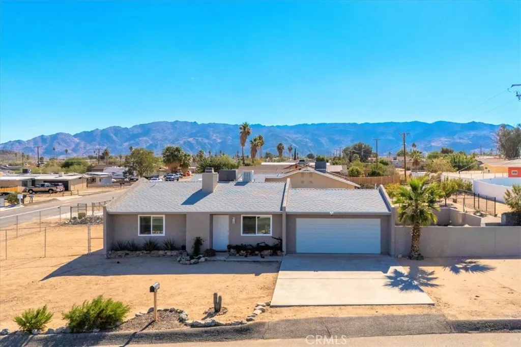 This Lovely Home is a Must-See! Being sold turn-key furnished, this is an amazing opportunity for all! Discover the perfect blend of comfort, style, and functionality in this beautifully updated home situated on a spacious corner lot. Set across from wide-open desert landscape, this property offers sweeping, unobstructed panoramic views to the North, enjoyed from both the exterior and the expansive picture window that brings the scenery right into your living room. Inside, fresh interior paint creates a bright, modern feel throughout. Newer laminate flooring compliments the cool tones. The cozy fireplace makes this the perfect place to unwind after a long day, or to host memorable gatherings with family and friends. This home is packed with upgrades, including a newer roof, newer HVAC system plus energy-saving evaporative cooling, new dual-pane windows, and a new garage door opener for added convenience. Fresh, plush carpeting enhances the bedrooms, while the bathroom showcases a brand-new tub and shower enclosure along with an updated vanity featuring double sinks. For additional comfort and versatility, a mini-split air-conditioning system has been installed in the garage, creating a pleasant environment for doing laundry, tackling projects, or completing everyday tasks. An attractive, large sliding glass door off of the kitchen leads to an inviting courtyard complete with a cozy firepit, perfect for evenings under the desert sky, outdoor dining, or relaxed gatherings with friends. Ideal for those who value outdoor space and versatility, the property features separate fen