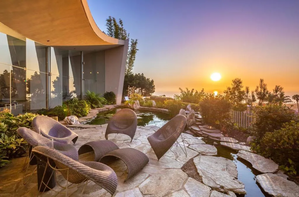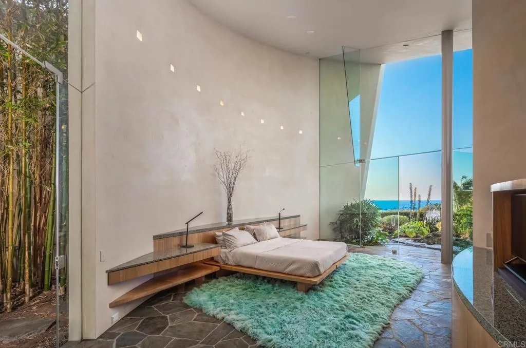 Available March 5! Superior Bold and Dynamic Contemporary Masterpiece. This unique distinctive free form structure rests upon the lush hillside within La Jolla framed byCoastal Vistas. Tucked away in a quiet Cul De Sac. Expansive single level approx 4,900 SF home, 3 bedroom, 3.5 baths with office, artist/loft/home theatre. 20 Foot floor to ceiling towering glass walls are both artistic and functional and act as a framing device for the unique structure itself. Fully enclosed private courtyard with protected glass walls, seamless indoor and outdoor living spaces open to expansive Coastal Vistas. Every custom detail is part of the whole 'LIVING IN ART" experience. Open Living/Great Room/Dining Room accented by crushed glass free form fire feature. MainSuite with disappearing doors and wall panels. Spiral staircase leads to artist retreat/theatre. Custom inset cabinets blend seamlessly into walls throughout. Gallery custom Kitchen with rough stone flooring and granite countertops. Backyard is completed by babbling water brook, tropical koi pond and natural canopy trees. Fully Furnished Luxury Long Term Rental. This barrier free design captures coastal views, downtown La Jolla, and theGolf Course. Stylish, Ultra Contemporary, Luxury Private Estate that connects to its natural surroundings.