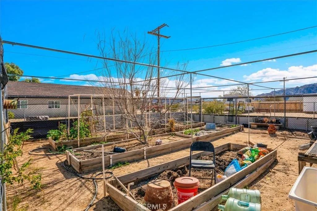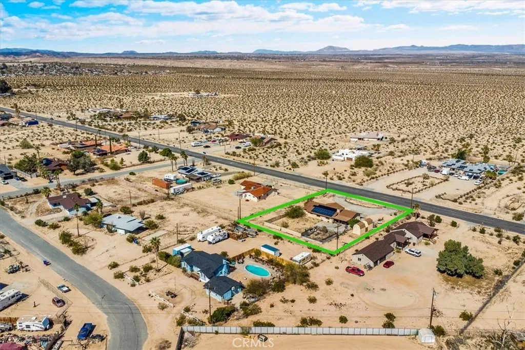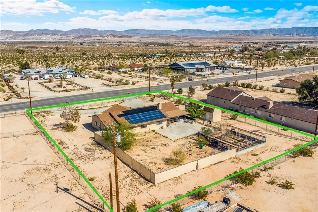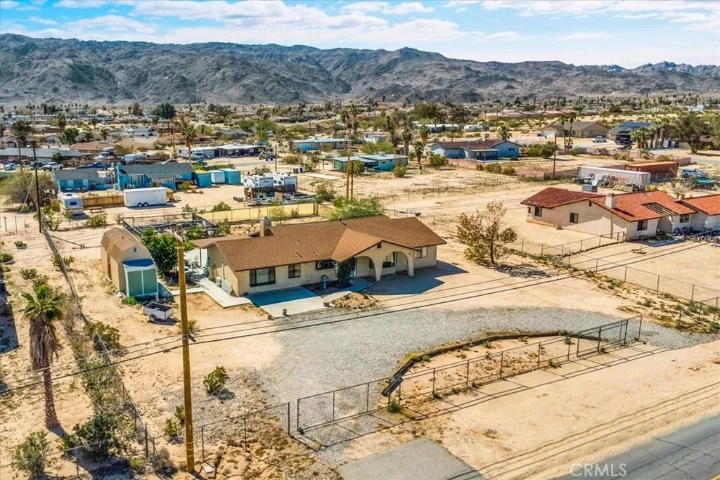 Looking for a spacious desert home or investment property with STUNNING mountain views?! Look no further! This centrally located home in the Chocolate Drop area of 29 Palms is nicely situated on .64 acres of land (FULLY FENCED) with a convenient semicircle driveway & beautiful mountain views to the North and South. Featuring 2,218 sqft of living space, this home offers a total of 4 bedrooms, 3 bathrooms, a family room AND a main living room with central heating & air throughout. The kitchen adorns warm wood cabinetry, matching white appliances, an oversized walk-in pantry and a large pop-out window above the kitchen sink to take in the beautiful desert views. Just off the kitchen is the light-filled living room which features a vaulted ceiling, a cozy wood-burning fireplace and charming built-in corner shelving. The 3 south-side bedrooms include newer ceiling fans and carpet flooring and the primary bedroom includes an ensuite bathroom with a single-sink vanity and shower/tub combo. This home also has a spacious laundry room just off the kitchen which leads to the 4th bedroom and 3rd bathroom (a previous garage conversion) complete with its own mini-split & walk-in closet making it a great guest room or second primary suite. Outside you'll be delighted to find a sizable covered patio, 3 SHEDS (2 of which are stucco'd and have 2 story storage rooms) and a fenced-in garden for those with green-thumbs. There are also Sun Run solar panels on the roof (currently not connected) that a buyer may either have removed or reconnected. With plenty of space to entertain or relax around