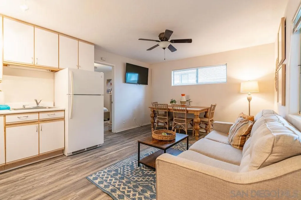 FURNISHED MIDTERM & LONG-TERM RENTAL — Beach Cottage in Seaside Town of La Jolla Village! Charming 1BR / 1BA La Jolla cottage just steps to Marine Street Beach and a short stroll to world-famous Windansea Beach! Perfect for a single, couple, or small family seeking a furnished coastal retreat near shops, cafés, and all the charm of La Jolla Village. Sunlit living area includes a queen sofa sleeper, flat-screen TV, ceiling fan, and cozy dining nook. Fully equipped kitchenette with all essentials. Bedroom features a comfortable king bed with soft linens and plenty of natural light. Bathroom includes walk-in shower. Shared patio area provides an inviting outdoor space for morning coffee or evening relaxation. Washer/dryer available in shared garage; parking is street only. Located on a large property with two additional units, this ground-floor cottage is the most quaint and private, attached to the garage. The entire property may be rented together to accommodate groups of up to 22 guests across three homes—ideal for family gatherings or retreats. Sleeping Setup (max 4): BR1: King • Living: Queen Sofa Sleeper 1 Full Bath Perfect for professionals, relocations, insurance housing, or extended vacations. Fully furnished only. Rates reflect short-term rental pricing and vary by season and length of stay. Published amounts are estimates; final pricing, fees, and availability are subject to change until a signed agreement. Please inquire for an exact quote.