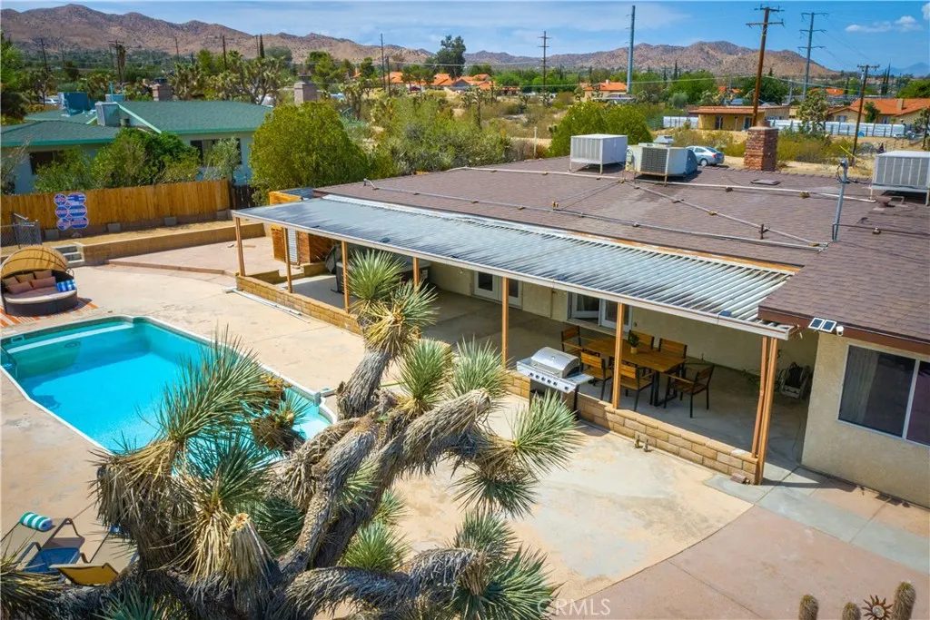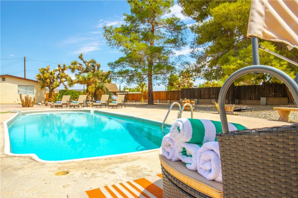 Welcome to 7737 Aster Ave, a stunning POOL home and successful Airbnb (FULLY FURNISHED / RENOVATED IN 2022) located in the heart of Yucca Valley. Nicely set on .62 acres of land, this gorgeous 4 bedroom, 3 bath desert home has been beautifully upgraded with everything intentionally chosen to bring you the perfect desert home, airbnb or weekend retreat. Upon arrival, youre greeted with a large, semi-circle driveway and manicured yard, showcasing pride of ownership from the moment you pull in. As you step inside the 2,375 square foot home you'll instantly notice the stunning floor-to-ceiling stone fireplace, warm wood-like flooring and large windows that let in an abundance of natural light. The second living room/den (currently set up as a game room) adorns beautiful exposed beams and a charming brick-faced fireplace for added ambiance. The kitchen is complete with ample cabinet space, mosaic tile backsplash, granite counter tops and stainless steel appliances. There is also a formal dining room just off the kitchen which open to the backyard, perfect for seamless indoor-outdoor entertaining. The primary bedroom features crown molding, two closets and a private full bathroom with a single-sink vanity and a walk-in shower. The second ensuite bedroom features sliding glass doors to the back yard, dual closets and a bathroom with a pedestal sink and tiled walk-in shower. The third bedroom also opens to the backyard through French doors and the third and most opulent bathroom adorns a timeless clawfoot bathtub, crown molding, tasteful gold accents and a custom antique-style vani