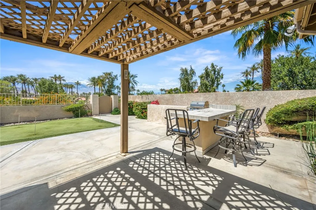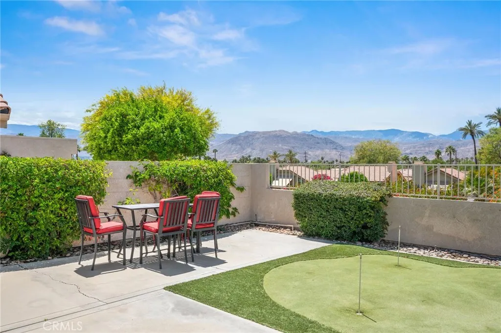 Premier Corner Lot in Guard-Gated Silver Sands! This is a rare opportunity to own one of the most desirable lots in the prestigious Silver Sands community. This beautifully upgraded single-level G-plan home sits on a premium corner lot, offering one of the few private yards in the development with unparalleled mountain views and direct access to two pools and spas just steps away. Featuring two spacious en-suite primary bedrooms, this highly sought-after floor plan boasts soaring ceilings and a completely open layout filled with natural light. The interiors have been tastefully reimagined with contemporary flair, including wood-look tile flooring, fresh bright paint, and stylish metallic tile accents. The chefs kitchen is open to the living and dining areas and showcases modern walnut-toned cabinetry, white quartz countertops, custom backsplash, stainless steel appliances, and a raised breakfast bar. The great room is surrounded by windows and anchored by a cozy fireplaceperfect for cool desert evenings. Both primary suites offer upgraded bathrooms with quartz counters, walk-in showers with wood-look tile surrounds, and generous walk-in closets. What truly sets this home apart is the expansive private yarda rare find in Silver Sands. Ideal for entertaining or relaxing, it features: Multiple patio areas for al fresco dining, Built-in BBQ with bar seating, Fire feature for ambiance, A putting green for added fun, Direct gated access to two nearby pools and spas. This fully furnished move-in-ready gem combines luxury, privacy, and unbeatable location within one of the deserts