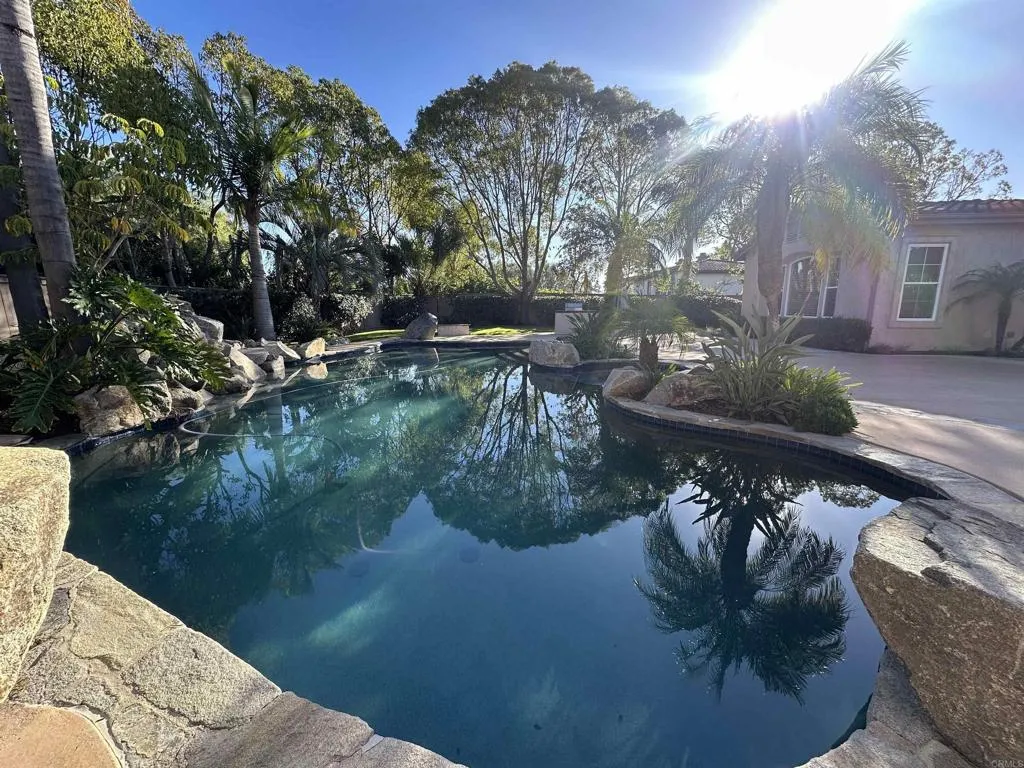 Discover luxury coastal living in this beautifully updated single-story estate featuring 5 bedrooms, 3.5 baths, and 4,412 sq. ft., plus a detached 1-bedroom guest house with an office/gym, full kitchen, and bath (approx. 750 sq. ft.). Stylish upgrades throughout include luxury vinyl plank flooring, fresh interior paint, recessed lighting, new baseboards, and a fully renovated primary bathroom. The chefs kitchen impresses with a massive center island, Sub-Zero refrigerator, Wolf gas range, Bosch double oven, Sub-Zero wine fridge, and large pantry. The open-concept layout flows effortlessly between the family room, dining room, and living roomperfect for both entertaining and everyday living. Step outside to your own private resort-style backyard with a sparkling pool and spa, soothing water feature, pool solar, built-in BBQ, and lush tropical landscapingan entertainers dream. Additional features include a laundry room with sink and cabinetry and an attached three-car garage with epoxy flooring. Located in the highly sought-after Country Eloquence community, this home offers proximity to top-rated schools, shopping, dining, and Encinitas beautiful beaches. The detached casita offers the perfect retreat for guests, family, or a private workspace. Experience the perfect blend of coastal elegance, comfort, and timeless design in the heart of Encinitas.