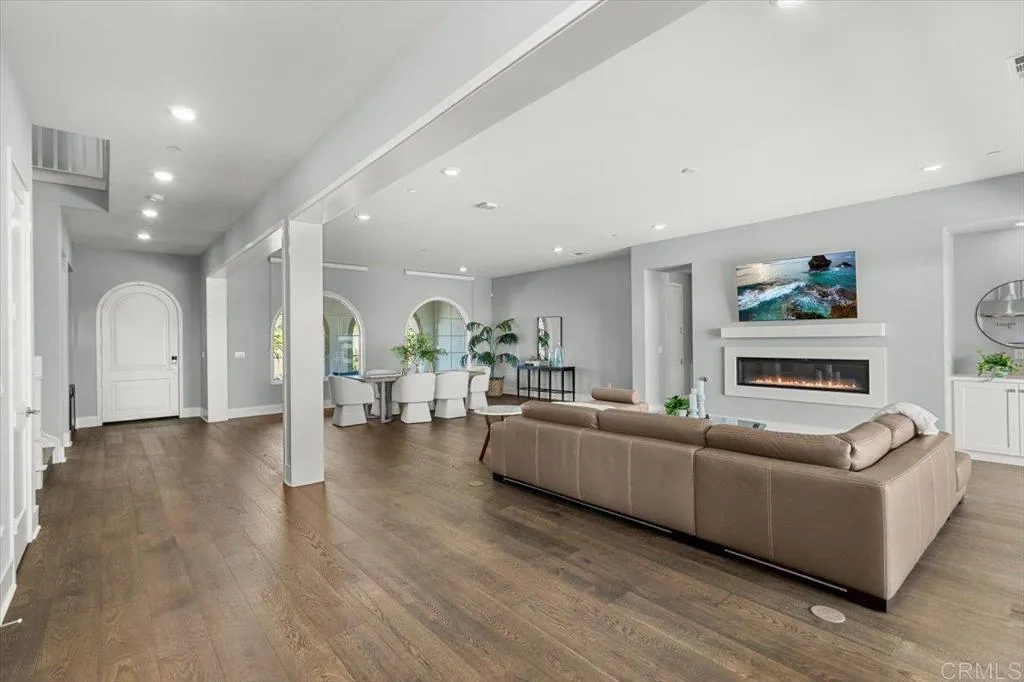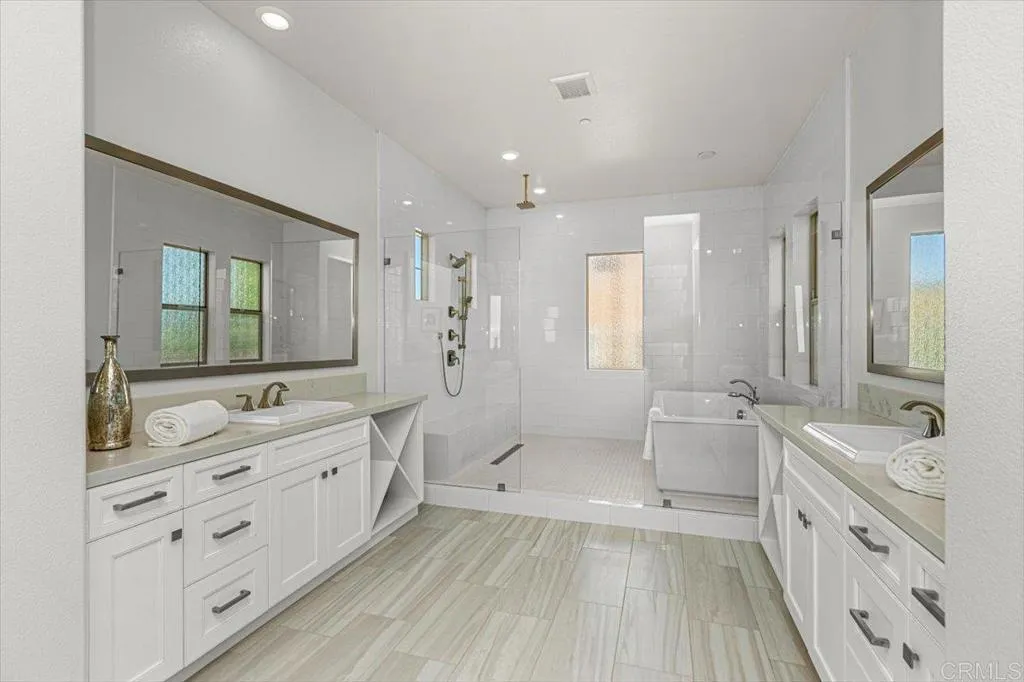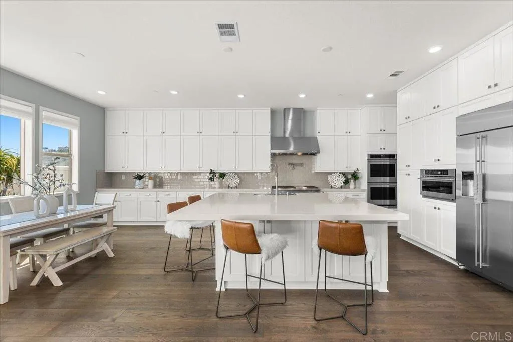 Beautifully upgraded and impeccably maintained, this exceptional 5-bedroom home in the highly sought-after gated community of The Estates in San Elijo Hills offers elegant design, a thoughtfully crafted floor plan, and inviting spaces designed for comfortable everyday living! Designed with entertaining and everyday living in mind, the homes layout, indoor-outdoor flow, and versatile gathering spaces create a lifestyle that is both comfortable and uniquely functional. Built in 2018 and offering approximately 4,813 sq ft with 5 bedrooms and 5.5 baths, the home sits on a nearly half-acre lot (20,512 sq ft) on a single-loaded street directly across from hiking and biking trails, providing privacy, open space, and scenic valley views. From the moment you enter, the home showcases rich wood flooring, designer finishes, and abundant natural light, with spacious living areas designed for comfort and connection. The upgraded gourmet kitchen anchors the home with quartz countertops, stainless appliances, a large center island, abundant cabinetry, and a generous walk-in pantry, flowing seamlessly into the family room where expansive folding glass doors open to the backyard, creating a true indoor-outdoor living experience. A standout feature of the home is the incredible flex/pool room, a unique entertaining space designed for gathering and hosting. Complete with a kitchenette, folding glass doors, and a pass-through serving window to the backyard, this versatile room allows guests to move effortlessly between indoor and outdoor spaces, making it ideal for hosting game days, celebrati