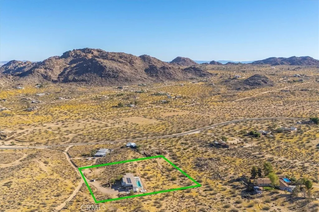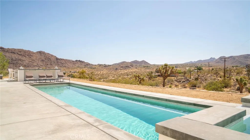 Set against the stunning backdrop of Joshua Tree National Park, this fully furnished 3-bedroom, 2-bath home is a rare offering in highly sought-after Monument Manor. Built in 2017 and thoughtfully designed with the modern desert dweller in mind, the home offers 1,806 square feet of contemporary living space nestled among rolling hills and lush, natural landscaping. From the moment you arrive, youll be struck by the property's serene seclusion and panoramic views, which frame the dramatic desert terrain in every direction. The landscaping is a work of art, featuring native species such as mesquite trees, yuccas, Joshua trees, ocotillos, acacia, and palo verdeall enhancing the sense of harmony with the natural surroundings. Inside, the home showcases sleek concrete floors, soaring ceilings, and 8-foot exterior doors that invite light and air throughout the open-concept floor plan. The expansive living and dining areas flow effortlessly into a custom-designed kitchen equipped with high-end Bosch appliances, an induction cooktop, a water filtration system, and custom cabinetry tailored for those who love to cook and entertain. Every detail has been considered for both luxury and functionality. The bedrooms are generously sized, while the bathrooms feature tasteful, high-end finishes and thoughtful design touches. Climate control is handled by a Nest-managed central HVAC system, and the home is powered by paid solar, making it fully electric and energy-efficient. Stepping outside, the property transforms into your own private resort. A custom in-ground pool and spa create the pe