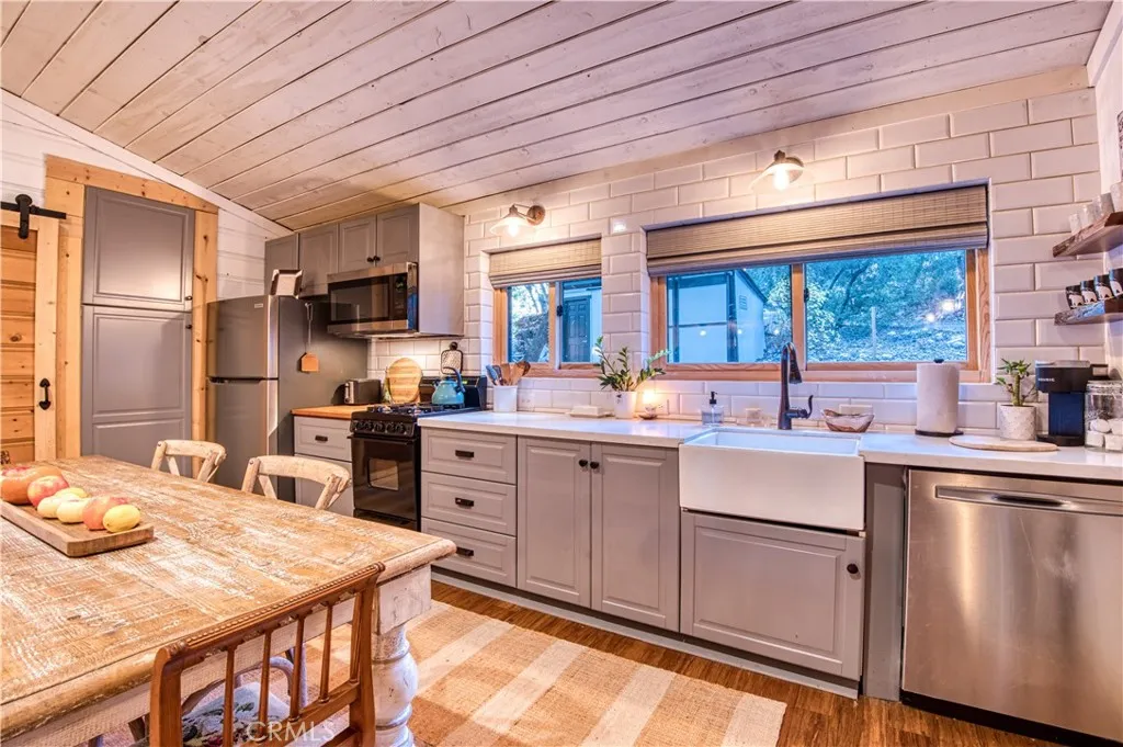 This fully refreshed 2-bedroom, 1-bath home has been remodeled with care, offering a warm and comfortable single-level living experience thats truly move-in ready. With its peaceful setting and turnkey updates, the property has also been a SUCCESSFUL VACATION RENTAL, though buyers should verify all rental requirements and possibilities with the county. The covered entry opens to an inviting living room with a stone fireplace, connecting to a bright kitchen with white stone counters, an oversized sink, tile backsplash, and stainless appliances. Dual-glazed windows, a blend of restored fir floors and new composite wood, and forced-air heating help keep the home cozy in every season. The primary bedroom leads to a private balcony with forest views and a glimpse of San Bernardino Peak, while the updated bathroom connects to a second bedroom with bunk beds for added versatility. Outside, two detached sheds provide convenient storage, and the backyard now includes a fun dart/game area along with neatly organized firewood for easy use.