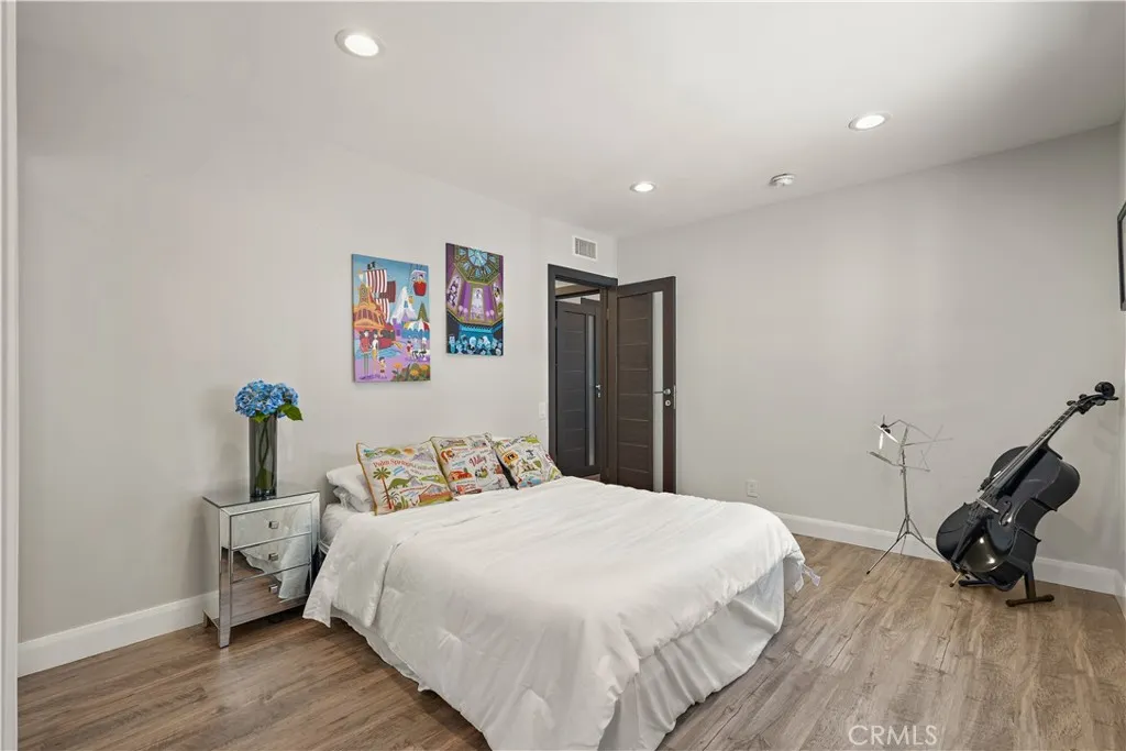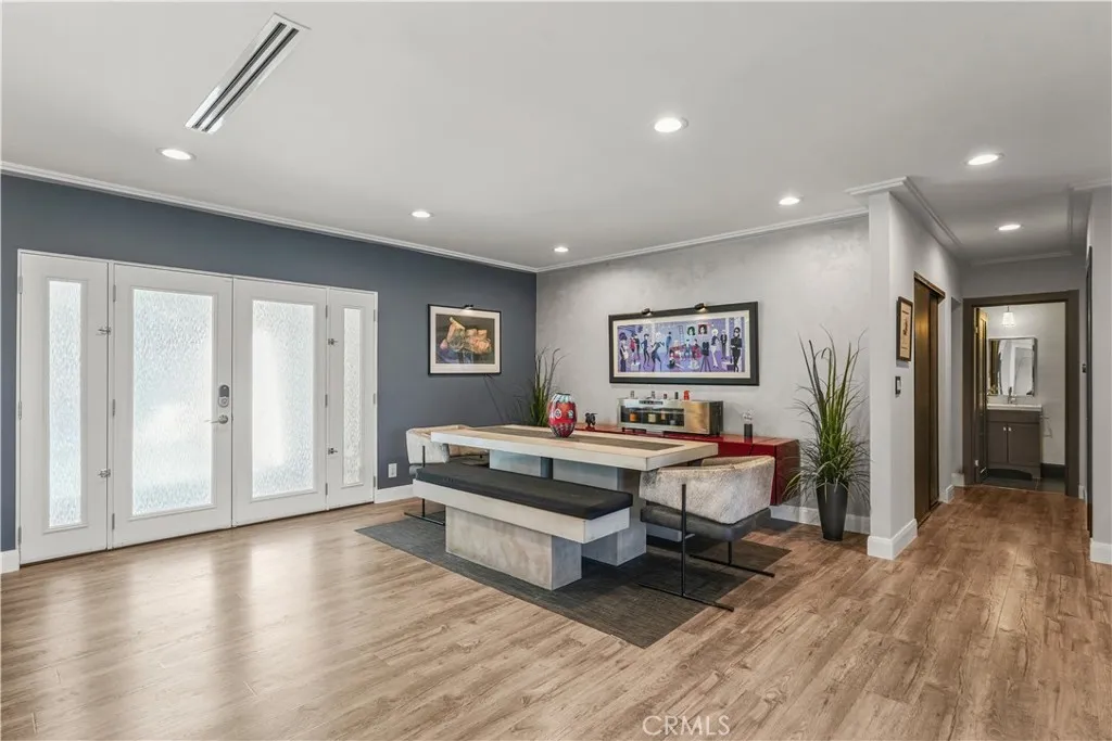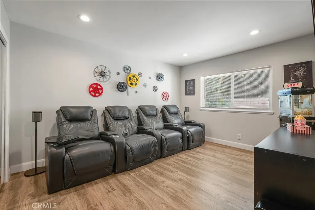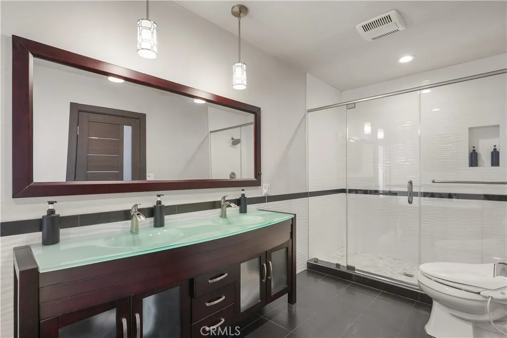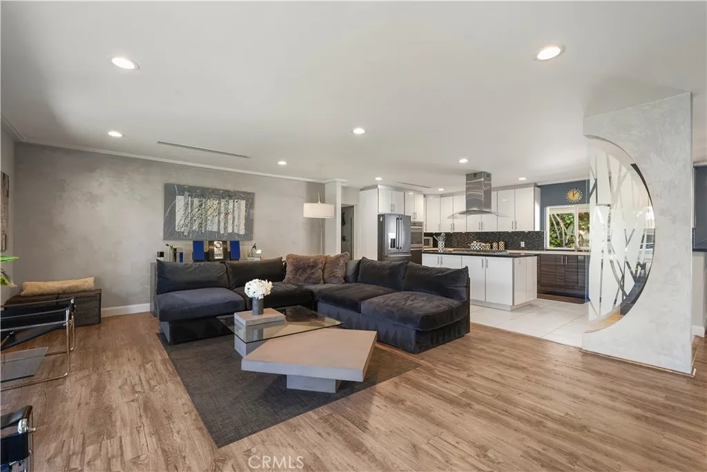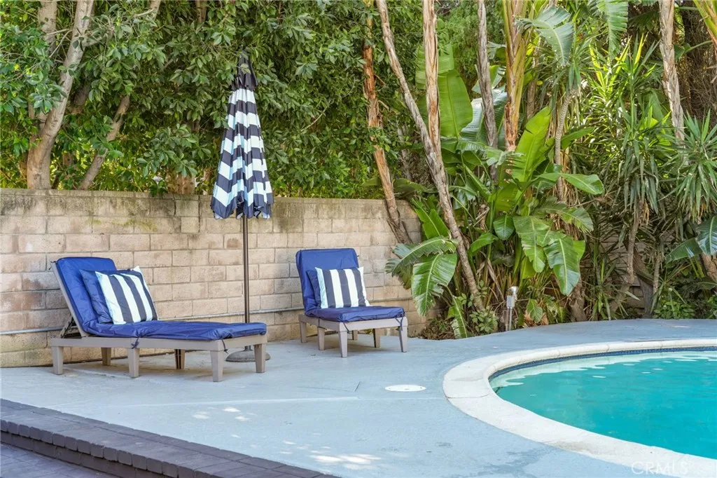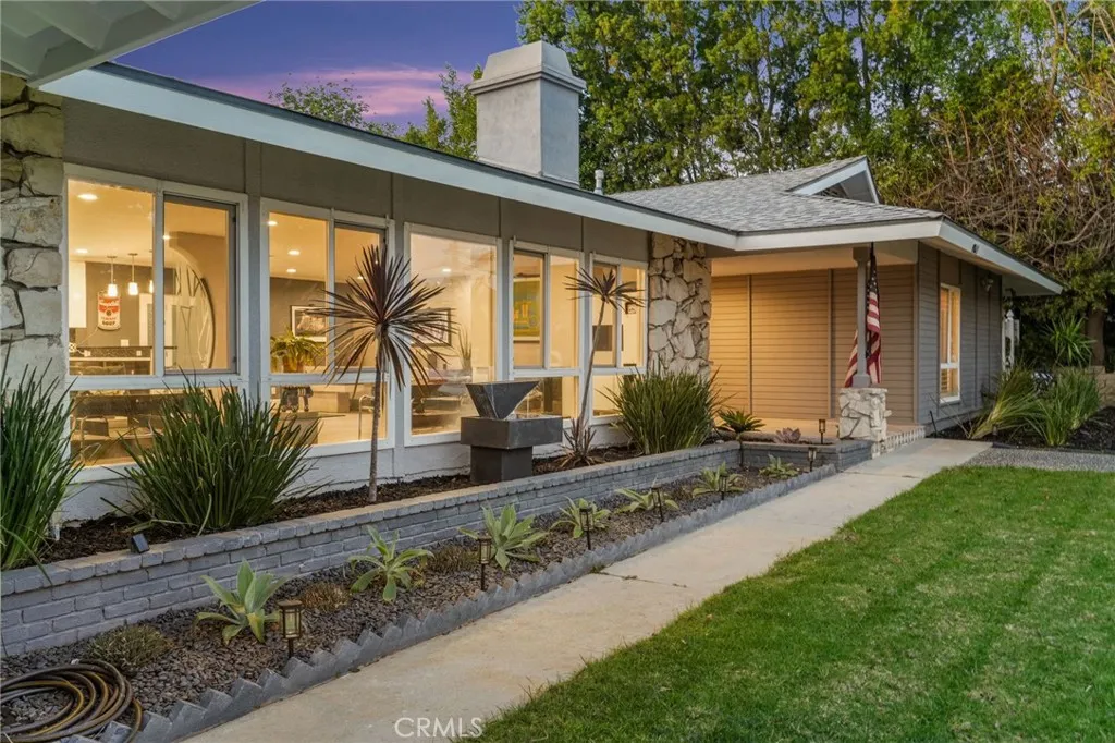 Inspired by mid-century modern designlarge windows, abundant natural light, and effortless open spacesthis refined Northridge residence offers elevated living on a quiet cul-de-sac. Set on an expansive 11,000+ sq ft lot, the home features an inviting curb presence with manicured front landscaping, water feature, and double door entry. With 2,821 sq ft of thoughtfully remodeled interior space, this 6-bedroom, 4.5-bath home showcases clean modern lines and upgraded finishes throughout. A stylish entryway flows effortlessly into the spacious open living area bathed in natural light pouring in from the wall of windows. Architectural design elements excite with elegant Venetian Plaster-like finish on accent walls, similar finish on mixed media room divider, sleek modern fireplace, and slim-lined air vents. Double French doors with additional side panels extend the living space outdoors to the private backyard retreat with lush greenery, pool, spa, and fire pit. The updated kitchen blends striking contrast and harmonious design, featuring an oversized island crowned with a designer range hood, a peninsula breakfast bar, two-tone cabinetry edged with white quartz countertops offering abundant counter space and set off by black glass tile backsplash, stainless steel convection double ovens, and a large four-compartment black refrigerator. The luxury primary suite offers exceptional comfort and style with generous windows, a walk-in closet, and a spacious updated bath with textured tile walls, glass-topped dual vanity, large walk-in shower, separate soaking tub, and a privacy window