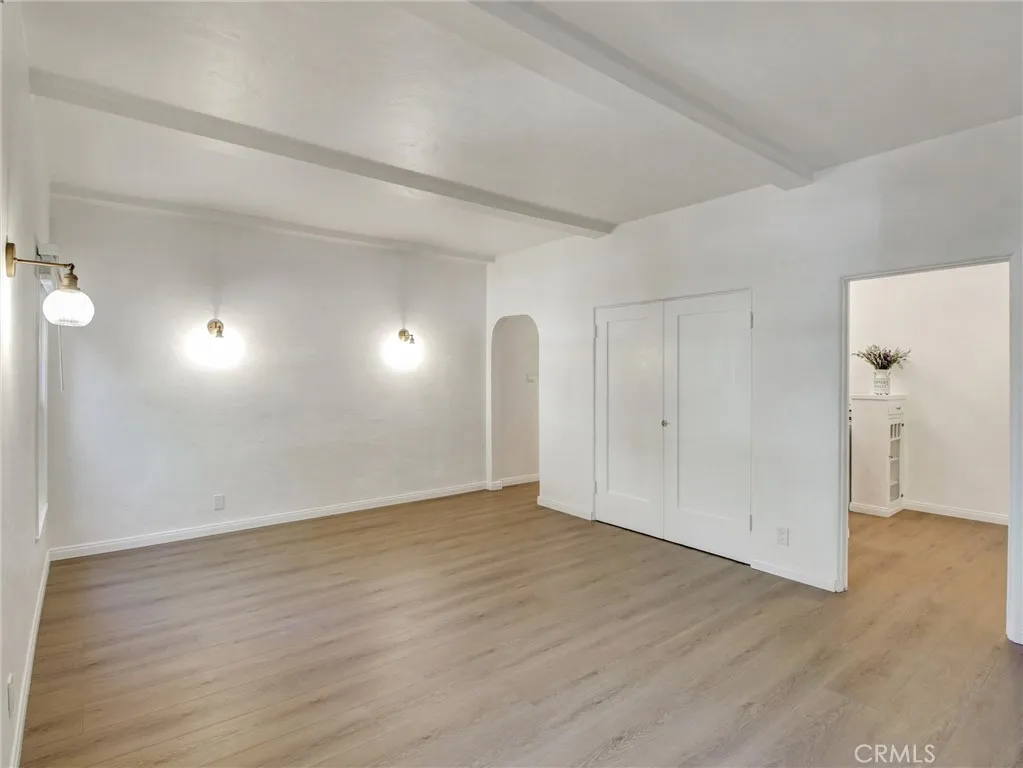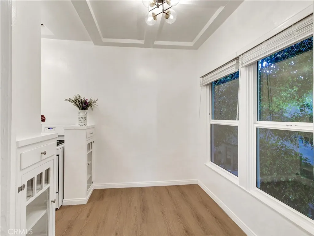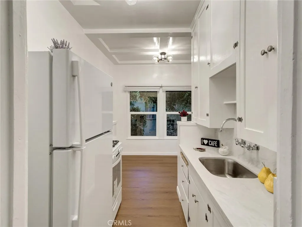 Charming old world 1930s Spanish gem with upgrades in highly sought after Beverly Hills. Classic beauty oozing with charm and character in this beautifully updated 1-bedroom, 1-bathroom upper-level apartment in a small 8-unit Spanish-style building in Beverly Hills. Offering approximately 750 square feet, this top floor back corner unit is filled with natural light, architectural character, and tasteful upgrades that make it a true standout. From the moment you enter, you're greeted with high ceilings, new wide plank laminate flooring, throughout and vintage details that evoke classic 1930s charm. The spacious living room features a decorative fireplace, large closet and picture windows that bathe the space in sunlight while offering serene treetop views. Adjacent to the living area is a delightful dining area with vintage cabinets, perfect for entertaining or enjoying a quiet meal. The updated kitchen features quartz countertops and backsplash, white cabinetry, and includes a refrigerator and stove. The spacious bedroom offers a peaceful retreat. The elegantly updated bathroom includes a separate soaking tub and walk-in shower, complemented by wall tiles,upgraded flooring, and a modern vanity plus a surprising period storage area. Additional highlights include a shared back patio surrounded by vibrant landscaping and a mature orange treean ideal space to relax outdoors. A common laundry room is available for your convenience. ALL utilities are includedelectricity, gas, water, and trash removaladding unbeatable value to this incredible lease offering. A one car carport park