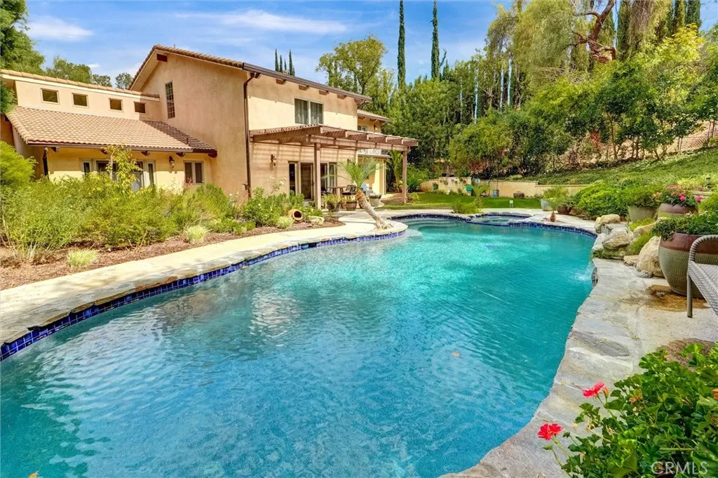 Discover unparalleled luxury and comfort in this exquisite, remodeled two-story single-family home ideally situated on one of Tarzana's most prestigious streets, south of Ventura Blvd. Tucked away at the end of a privet road. Spanning nearly 5,000 square feet of refined living across a sprawling half-acre lot. This gated residence delivers seclusion and sophistication, featuring high-end finishes and an incredible resort-style backyard. From the grand double-door entry welcomes you into an impressive foyer with soaring ceilings and wood beams. 5 oversized bedrooms, each with a private, en-suite bathroom, provide ultimate comfort and privacy. The flexible layout features 2 bedrooms conveniently located on the main floor and 3 upstairs, complemented by dedicated office. Beyond large formal living and dining rooms, the massive chefs dream kitchen is the heart of the home, equipped with premium fixtures, a stunning center island, and high end appliances like the Subzero refrigerator and Viking stove. A large formal living room with wood beams ceiling, stressed hardwood floors, fireplace and an abundance of natural lights streaming through energy efficient windows. Retreat to the primary oversized bedroom, a private sanctuary featuring its own luxurious en-suite large bathroom, walk-in closet, separate make up area and a dedicated with sitting area fireplace and 2 balconies , a perfect spot for unwinding. Attached 3 car garage with circular driveway and direct access to house. The thoughtfully designed floor plan includes a spacious family room that seamlessly opens to professio