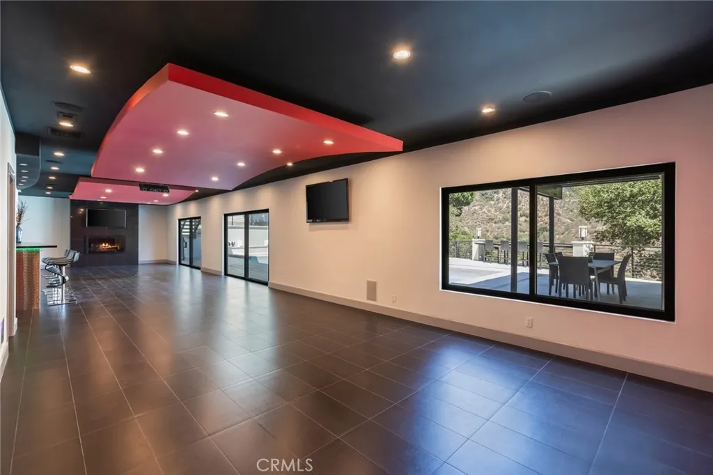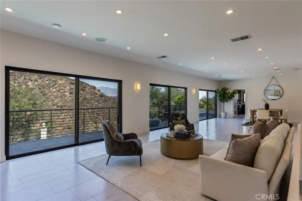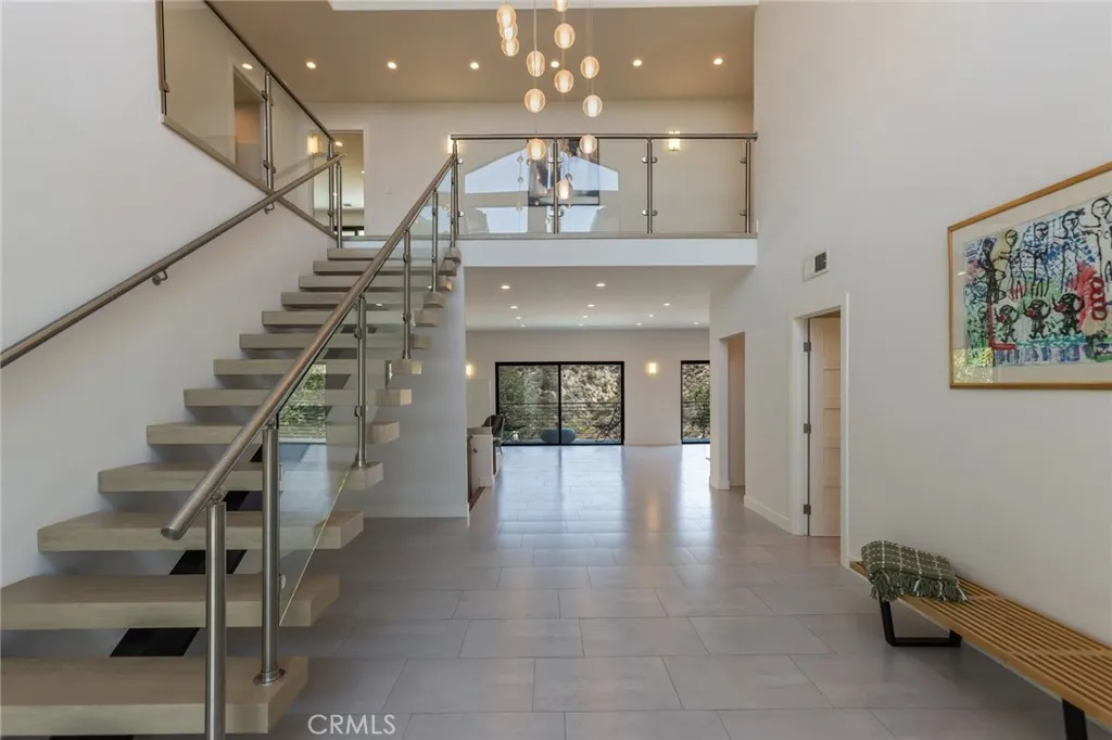 Poised along Glendales most coveted address, Rimcrest Drive, this contemporary estate unfolds across more than 6,000 square feet of inspired design, marrying architectural artistry with resort-style amenities. Spanning three impeccably crafted levels beneath a striking metal roof, the residence commands unobstructed vistas that sweep across the canyons. From the upper levels, the views extend to the glittering skyline of downtown Los Angeles. The principal level serves as the epicenter of daily life, where voluminous living and dining spaces are bathed in natural light and framed by soaring ceilings, floating staircases, and walls of glass. A chefs kitchen anchors the floor-plan, complemented by a refined office/library that affords both privacy and versatility. The lower entertainment level is devoted to leisure and conviviality, offering an expansive lounge, sleek bar, full bath with shower, and a secondary laundry area. This floor flows seamlessly to the outdoors, where a heated saltwater pool, a fully appointed covered barbecue kitchen, and generous terraces create an idyllic retreat for alfresco entertaining beneath the stars. The upper level is reserved for private living, encompassing four bedrooms and three bathrooms, including a primary suite of grand proportion. Here, a spa-inspired bathroom, an oversized walk-in closet, and a dedicated shoe closet evoke the ambiance of a private dressing salon, while an additional laundry area enhances convenience. Distinguished appointments include three fireplaces, three HVAC systems, a whole-house audio system, dumbwaiter, wat