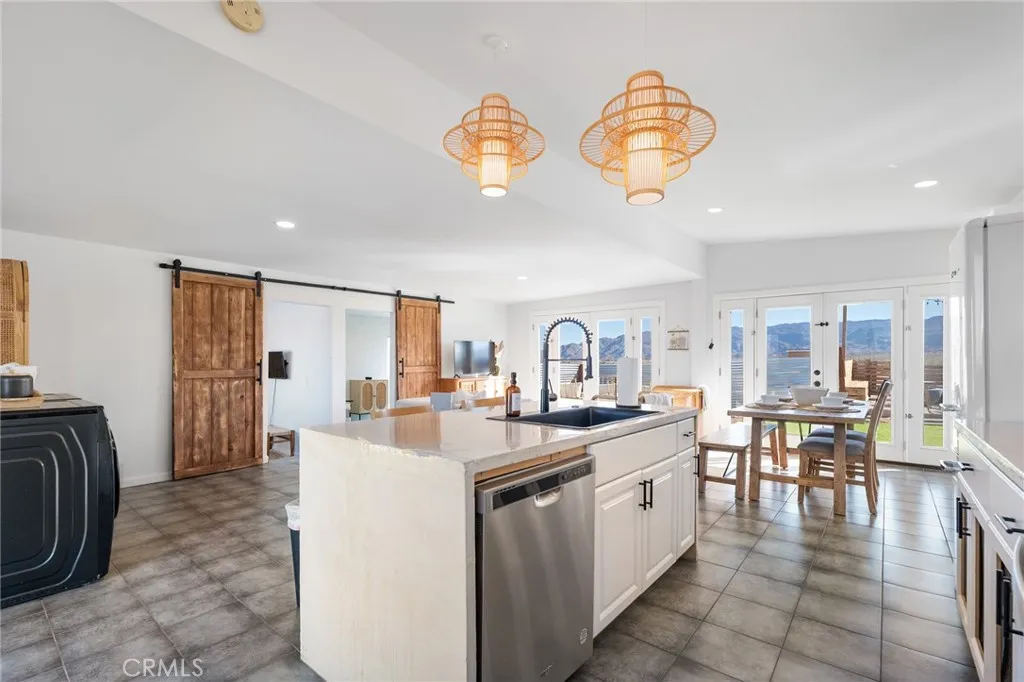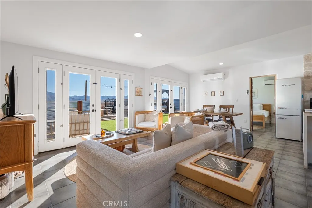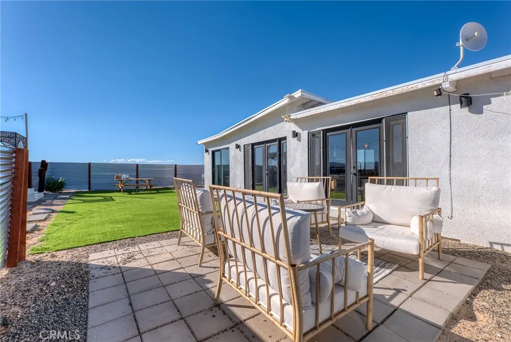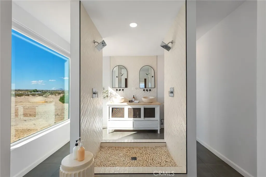 Experience the ultimate in refined desert living with this modern sanctuary, perfectly positioned on five private acres and surrounded by ninety acres of untouched government land that guarantees forever-protected views and complete tranquility. Thoughtfully remodeled, this two-bedroom, two-bath retreat embodies effortless sophistication, blending timeless design with the raw beauty of the high desert. The open-concept interior is bathed in natural light, highlighting designer furnishings, Leanne Ford pieces, and curated finishes that create a warm yet contemporary aesthetic. Custom Zia Tile, premium fixtures, and bespoke details bring elegance and craftsmanship to every space. The primary suite features a king bed and a spa-worthy bathroom with a dual-head shower, while the guest suite offers equal comfort and style, each room equipped with modern amenities for year-round enjoyment. Outside, the home transforms into a private resort experience. A heated swim spa, spa, fire pit, and expansive sun deck invite relaxation beneath endless desert skies, while the fully fenced yard provides both intimacy and immersion in the surrounding landscape. Perfect for entertaining or quiet reflection, every inch of this property is designed to embrace the serenity and grandeur of the Mojave. Ideally located just minutes from Joshua Tree National Park, the Marine Corps base, and the vibrant arts and culinary scene of 29 Palms and Joshua Tree Village, this residence offers the rare combination of seclusion and accessibility. Whether envisioned as a personal retreat or an exclusive investmen