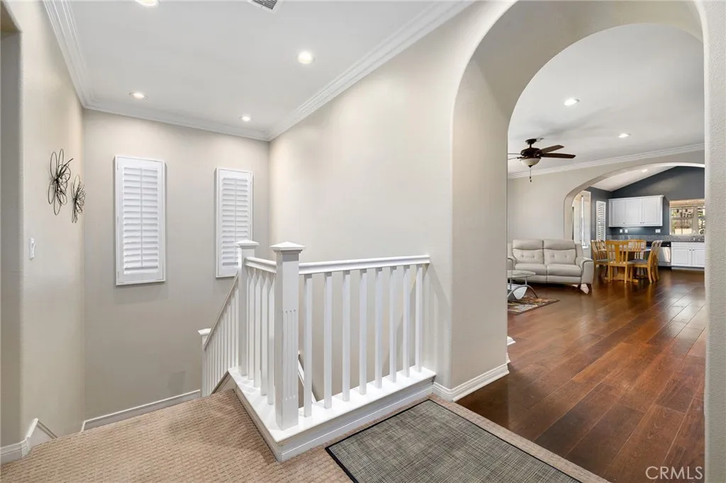 Step into this stylish two-bedroom, two-and-a-half-bath home offering 1,830 square feet of comfortable living. The entry level features a versatile room with crown molding that can easily serve as an office, guest room, or third bedroomperfect for todays flexible lifestyle. Upstairs, the open floor plan connects the living room, kitchen, and dining area in one bright, airy space ideal for both everyday living and entertaining. A cozy balcony extends the living area outdoors, providing a relaxing spot for your morning coffee or evening unwind. The two upstairs bedrooms also with crown moldings are separated with arched walk ways. As a corner unit, youll enjoy extra natural light and privacy, making this home feel even more spacious and inviting. Modern finishes, thoughtful layout, and convenient design come together beautifully in this move-in-ready condominium ready for you to make it your own.