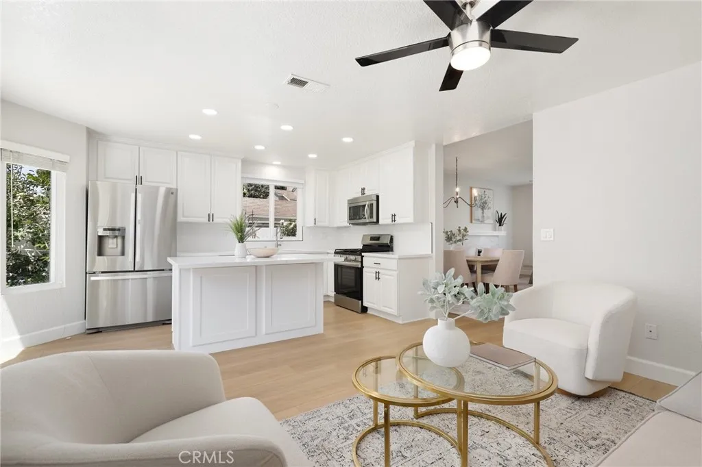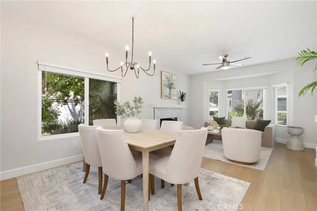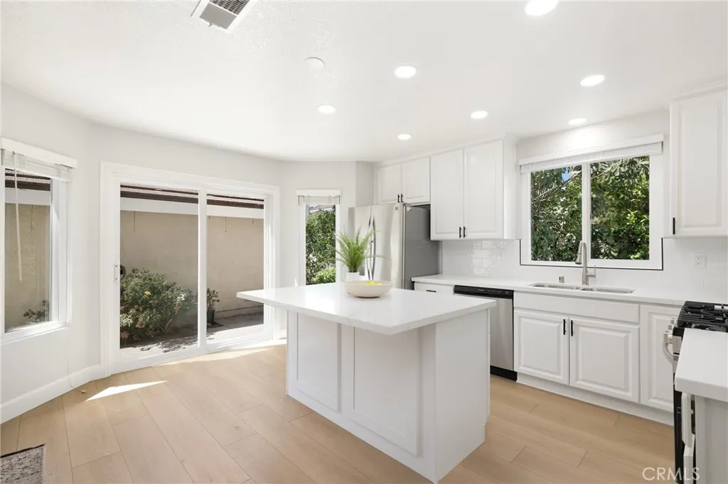 Welcome to this beautifully upgraded end-unit townhouse in the highly sought-after neighborhood of Woodbridge. Spanning 1,406 square feet, with 3 bedrooms and 2.5 baths, this light-filled, two-story residence is ideally located at a quiet cul-de-sac, boasting a rare, extra-large side yard adorned with lush green foliage and fruit trees. Step inside to discover a spacious living room accented by a cozy fireplace, abundant natural light, and new fresh designer paint throughout. Downstairs features newly upgraded Luxury Vinyl floors that complement the inviting kitchen and den area, complete with new quartz countertops, new tile back splash, white shaker-style cabinets, stainless steel appliances, and recessed lighting and eat at island. Upstairs, you'll find upgraded bathrooms with newer floors, faucets, high-end roller shower/tub door enclosures as well as new neutral carpet, new ceiling fans, and new custom-ordered mirrored closet doors. Enjoy the convenience of newer windows and patio doors with dual-pane glass, enhancing energy efficiency and tranquility. This townhouse offers more than just a home; it provides a lifestyle within the resort-like amenities of Woodbridge. Residents enjoy access to two lakes with docks, two beach lagoons, over 15 swimming pools and spas, including saltwater heated pools, along with over 20 tennis courts and several pickleball courts. The community also features numerous parks with playgrounds, volleyball courts, and scenic tree-lined streets perfect for leisurely walks. Located within the top-rated Unified Irvine School District, residents b