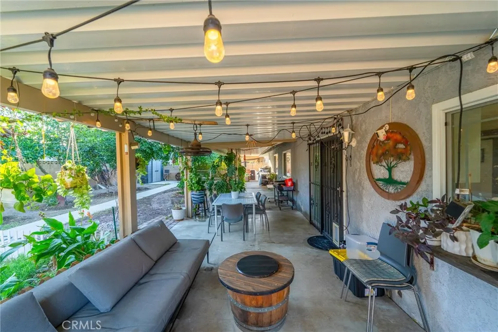 Welcome home to this beautifully maintained single-story, 3-bedroom, 2-bath ranch-style residence, located in a serene neighborhood. Inside, the light-filled country kitchen features granite countertops, plenty of cabinets, stainless steel appliances, a breakfast bar, recessed lighting and updated finishes. The spacious living room offers hardwood flooring, a striking brick fireplace, custom shutters, and a ceiling fan perfect for both relaxing and entertaining. The frontside exterior has a showcasing circular driveway, gated entry for recreational vehicles, desert toys, or potential RV parking, and an attached two-car garage. A cozy sitting area behind a wrought-iron gate creates a private retreat, surrounded by citrus trees a large back yard and highlighted by a great size Aluma wood patio cover excellent for family gatherings, barbecues and guests entertaining. This home features no HOA, low property taxes, and a prime location close to schools, parks, and shopping.