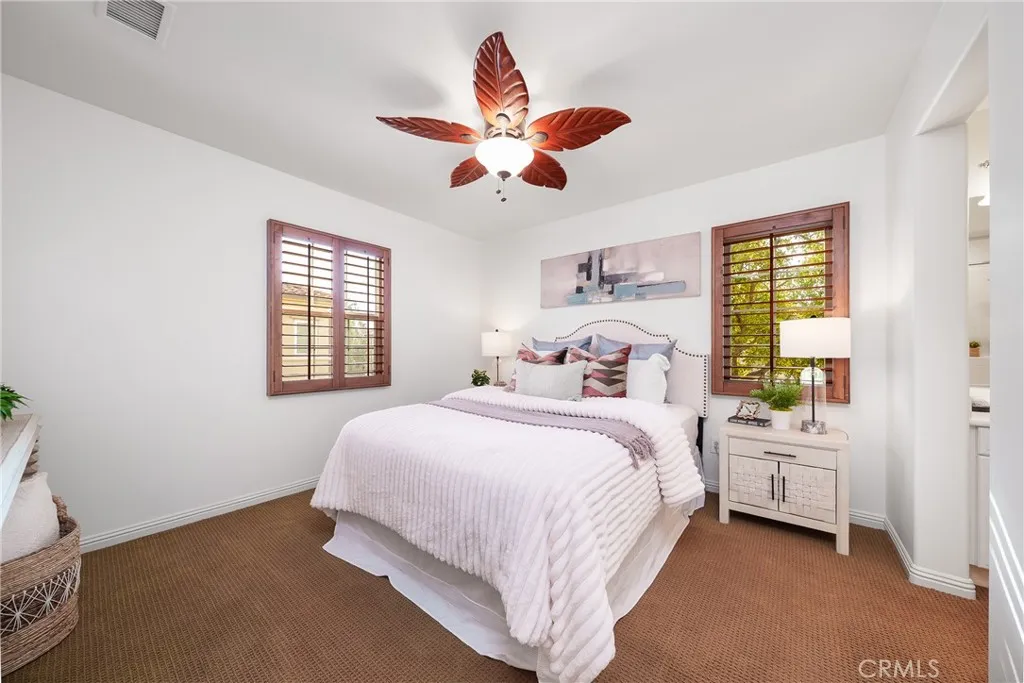 Beautiful Corner Lot Home with Dual Primary Suites in Woodbury, one of the most desirable communities in Irvine. This stunning corner lot home radiates pride of ownership throughout and offers an exceptional blend of comfort, style, and quality upgrades. Featuring two primary suites, each complete with full showers and a solar tube in the primary bath with built in night light and spacious walk-in closets. This thoughtfully remodeled residence provides the perfect balance of luxury and functionality with spectacular views of the corner lot from almost every room. The first floor showcases beautiful Acacia hardwood flooring, while the second floor is complimented by soft Berber carpet. The remodeled kitchen is a true showpiece, featuring quartz countertops with a full-height backsplash, high-gloss white laminate cabinets with premium hardware, LED under-cabinet lighting with adjustable color settings, and modern conveniences such as a pull-out trash system, Super Susan tray storage, double knife drawer, new Kohler pull-down gooseneck faucet, Kraus stainless steel sink with rounded corners, and high end Samsung Bespoke dishwasher, refrigerator and microwave. A large walk-in pantry is located just off the kitchen, offering ample storage space. Additional home features include ceiling fans, window treatments that include Bass wood shutters, roller shades and woven blinds. as well as PEX piping throughout, new water heater, Brondell bidet systems in both primary suites with Kohler showerheads, Kohler hardware throughout the home including all faucets with metal drains and downst