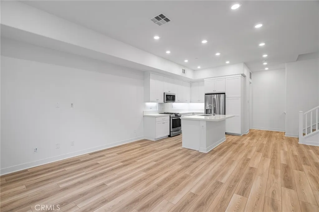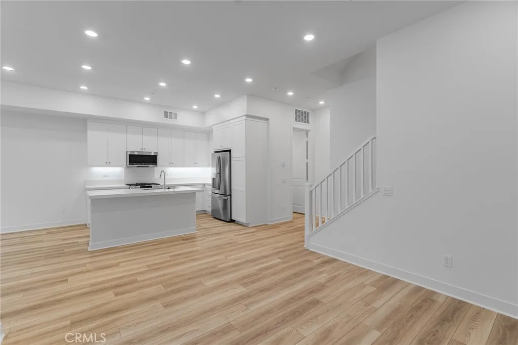 Welcome to this modern tri-level townhome featuring bright open living and a private rooftop deck. The main level offers a spacious great room with recessed lighting, luxury vinyl flooring, and an upgraded kitchen with white shaker cabinets, quartz countertops, stainless steel appliances, and a large island. Enjoy a covered balcony plus a generous rooftop terrace perfect for relaxation or entertaining. Additional features include an attached 2-car garage, in-unit laundry, and contemporary finishes throughout. Located in a newer Montebello community close to shopping, dining, freeways, and minutes from DTLA, this move-in ready home offers comfort, style, and convenience.