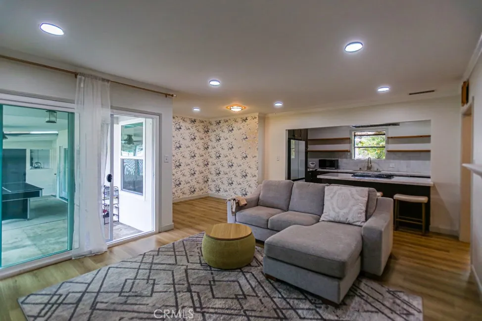 Settle in, you're going to love it here. Mature landscaping and classic curb appeal set the tone, inviting you inside to see what makes this space truly special. Step into the main living area and feel the openness wrap around you. The kitchen and living room flow together effortlessly, anchored by recessed lighting and a beautiful quartz countertop running the length of the island, just begging you to sit down and enjoy a morning coffee or a cocktail hour with friends. Just off the main space, the secondary step-down living room feels like its own little world -exposed beams overhead, a charming brick fireplace, and plenty of room to settle in for movie nights, winter snuggles, or slow Sunday afternoons. This home's thoughtful updates continue throughout, including a remodeled bathroom with a crisp tile shower and glass doors, plus new windows that make every room feel fresh and connected. Step outside to a covered patio designed for real living - a private BBQ area, space to unwind, and a beautifully landscaped backyard that seems to calm you the moment you step out. All of this sits in one of Anaheim's most prestigious neighborhoods, close to the 5, 57, and 91 freeways, incredible dining and entertainment in the Packing District and downtown, and of course, just a short 5-minute drive from Disneyland.