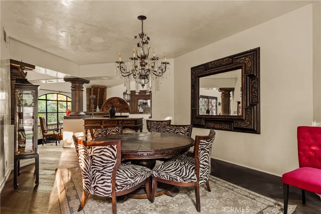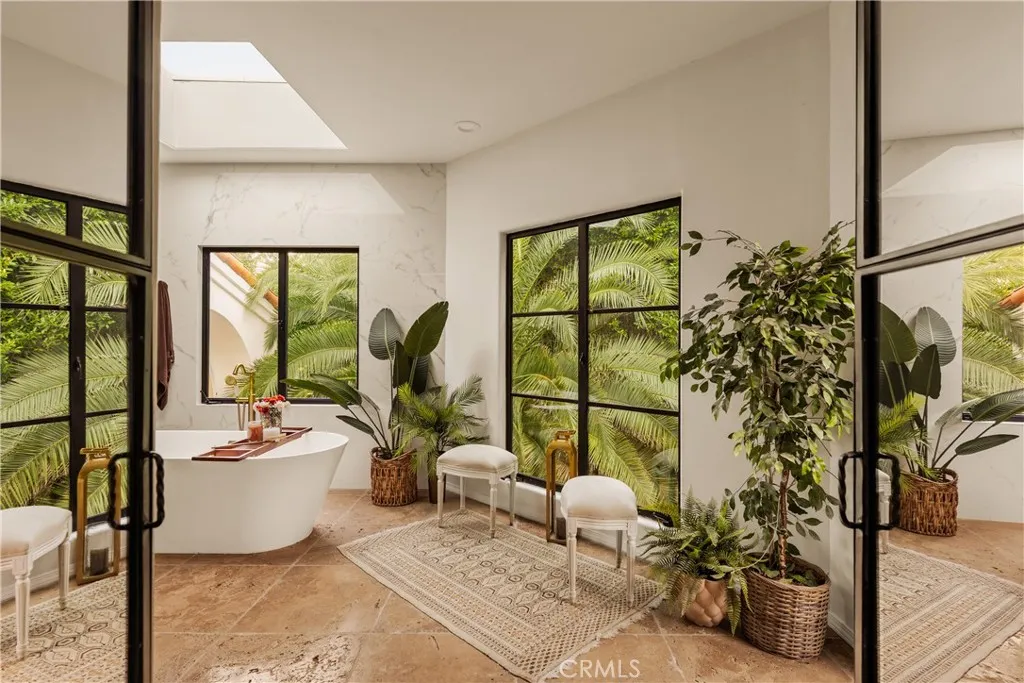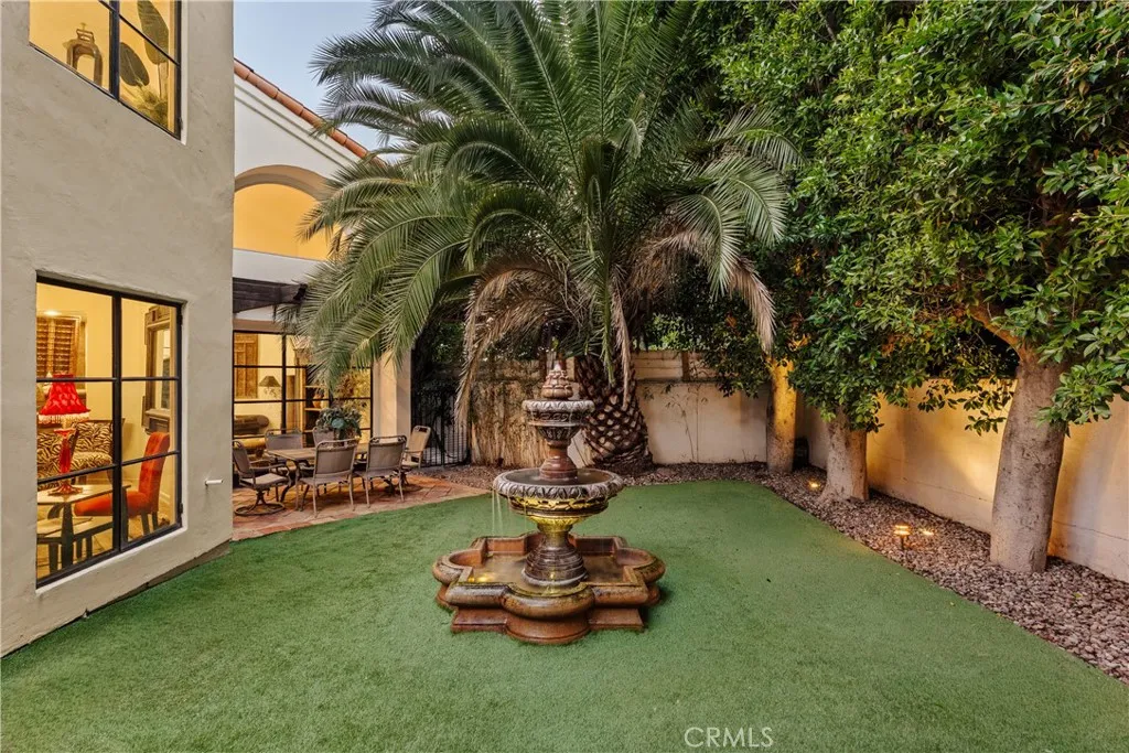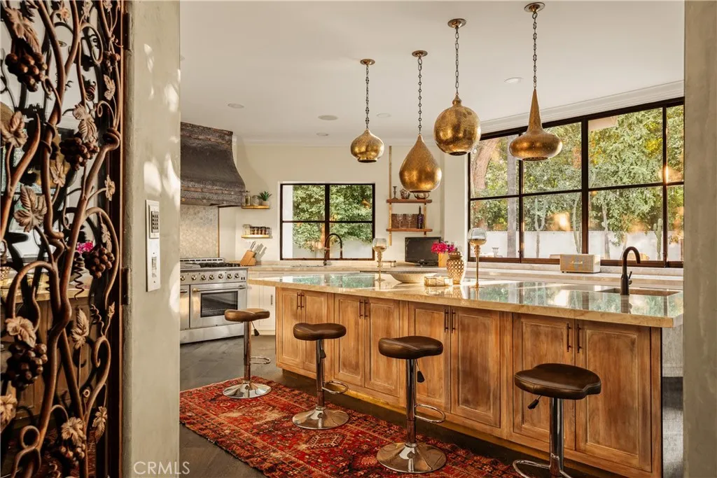 Tucked away behind gates just off Ventura Boulevard, this Mediterranean-style retreat offers premier Encino living with unmatched privacy and amenities. A long, gated circular driveway leads to a stately motor court and three-car garage, framed by lush landscaping and mature trees that shield the home from the street. Step through custom wrought iron doors into a dramatic foyer, where soaring ceilings, a sweeping staircase, and elegant tile floors set the tone. The main level features a grand family room with an ornate fireplace, a formal dining room, a sleek bar, a game room, and a glass-enclosed sunroom with a beverage station. The spacious kitchen is designed for gathering, while a separate maids suite with a private bath and laundry area provides convenience and flexibility. Upstairs, all bedrooms are thoughtfully arranged on the same level. The magnificent primary suite spans four rooms, offering a fireplace-warmed bedroom, sitting room, dressing room, and a spa-inspired bathroom with water closet. A private elevator ensures easy access. Each bedroom showcases treetop views through expansive windows, while a generous outdoor lounge connects to a rooftop deck via spiral staircaseperfect for sunset entertaining. The resort-style grounds include a sparkling pool and spa, outdoor dining area, and built-in barbeque, all enhanced by a Sonos sound system for seamless entertaining. With 5 bedrooms, 4 bathrooms, and over a third of an acre of serene grounds, this residence delivers both elegance and comfort in an unbeatable location close to freeways, restaurants, and shopping.