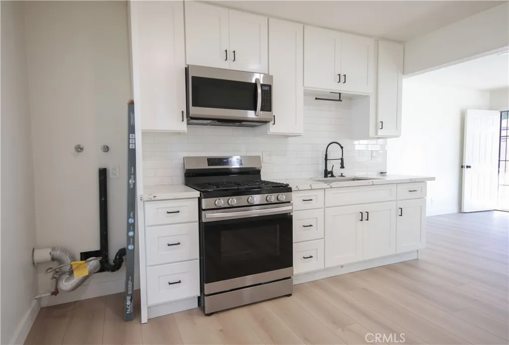 Sleek and modern 2BR/1BA is available for lease with immediate move-in! Upon entry, you'll love the warm and inviting open floor plan with light colored vinyl plank flooring throughout. The kitchen has been updated with white cabinetry offset with black hardware, and the quartz countertops have plenty of space and storage. The bathroom features an oversized step-in shower. Relax in the comfort of central heat/AC, and enjoy outdoor dining on your own private patio. Water, trash, and washer/dryer hookups included, as well as one car parking space in the detached garage and one additional assigned parking space. Great location within the Westminster School District, just off Beach Boulevard and quick access to the 22 Freeway. Just steps to Liberty Park.