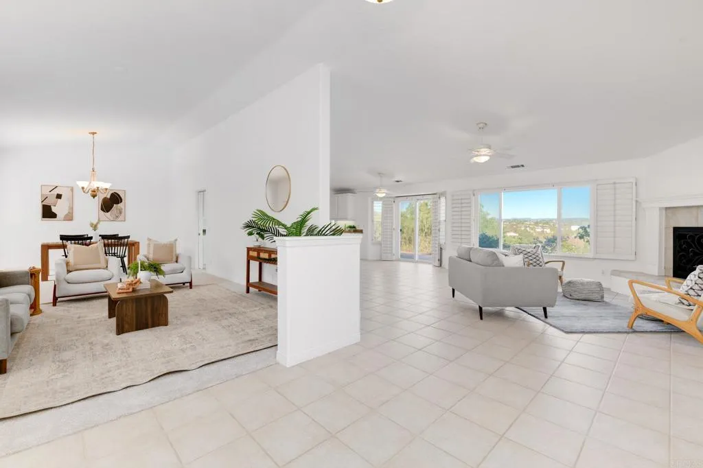 Beautiful custom single-story home, perched on over an acre with panoramic mountain views, fully fenced with a gated entrance in Fallbrooks desirable Olive Hill community. Thoughtfully positioned to capture sunrise-to-sunset vistas, every room is framed by natural beauty, enhanced by abundant windows, plantation shutters, and soaring ceilings. Outside, the sparkling pool and raised spa enjoy a secluded placement with expansive views creating a tranquil backdrop for relaxation or entertaining. The property is fully fenced and includes a separate fenced area ideal for horses, goats, or other livestock, offering the best of country living without sacrificing comfort or convenience. At the heart of the home is the gourmet kitchen, featuring a walk-in pantry, granite countertops, stainless steel appliances, a generous center island, and a large seating bar. A charming breakfast area overlooks the views and opens directly to the patio, perfect for morning coffee or casual poolside dining. The kitchen opens into the family room with fireplace and extends into the formal living and dining spaces, creating an open layout for everyday living and entertaining. The primary suite offers a peaceful escape with its spa-inspired ensuite bathroom, walk-in closet, dual vanities, jetted tub, and separate shower. A private sliding door leads directly to the pool and spa terrace, offering the perfect setting for quiet evenings or sunrise dips. Two additional bedrooms are located nearby, creating a comfortable layout for family or guests and a fourth bedroom, privately tucked away at the other e