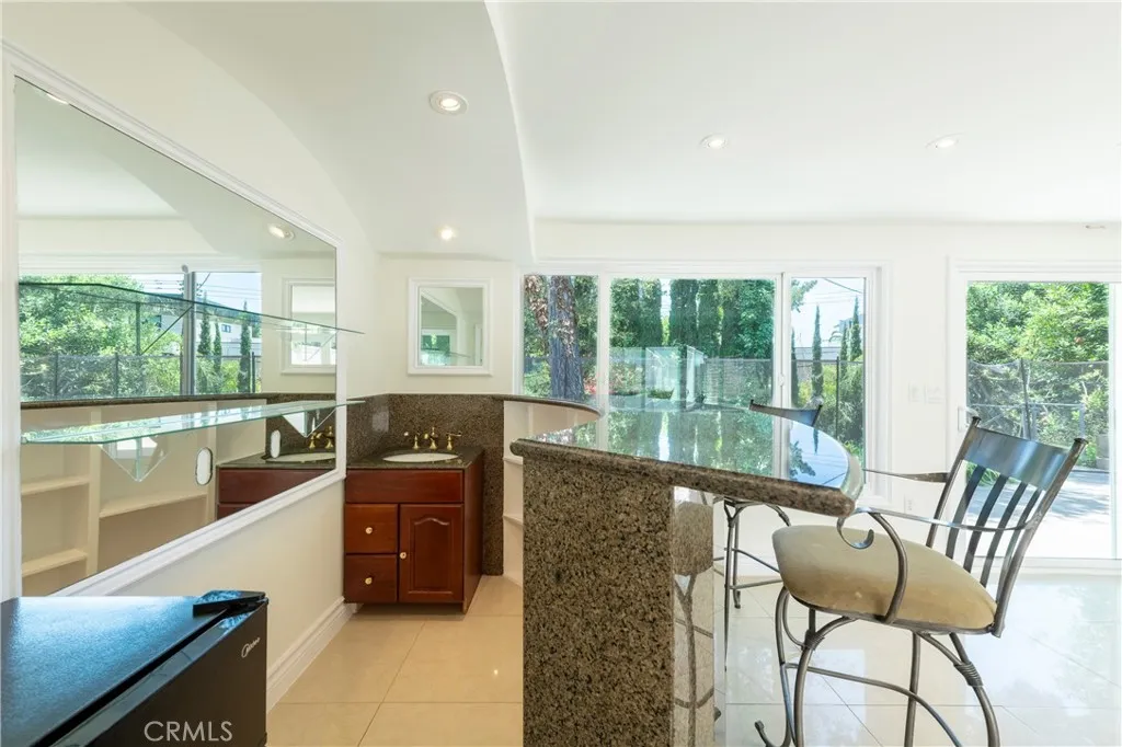 This exquisite single-story Spanish estate blends timeless elegance with modern sophistication. Set back from the street behind a private gate, the home welcomes you with a dramatic double-door entry that sets the tone for the refined interiors beyond. Inside, classic arched doorways, artisanal tile floors, and expansive walls of glass create a luminous ambiance, framing picturesque views of the lush backyard sanctuary and a serene courtyard. Three spacious bedrooms and three well-appointed baths and a versatile den offers the perfect option for a fourth bedroom, home office, or creative space. Designed for effortless living and entertaining, the generous common areas include a refined dining room with a built-in wine fridge, a warm and inviting family room centered around a statement fireplace, and an impressive wet bar ideal for hosting. The gourmet chefs kitchen is a true showpiece, featuring an oversized stone island, custom cabinetry, and top-tier appliances, including Bosch and Sub-Zero, complemented by a six-burner cooktop and dual convection ovens. The luxurious primary suite serves as a private retreat, complete with French doors that open to the resort-style backyard and a spa-inspired bathroom offering a jetted soaking tub, walk-in shower with seating, and dual bowl basins. Outdoor living reaches new heights with beautifully landscaped grounds enhanced by glass-paneled fencing that showcases verdant vistas and distant mountain views. Enjoy unforgettable gatherings with a built-in BBQ and pergola, seamless indoor-outdoor dining through expansive sliders, and a spa