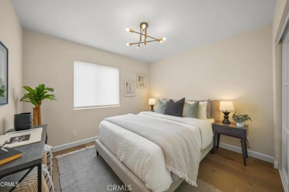 This wonderful townhouse features 2 bedrooms, 2.5 bathrooms plus an office/den and is within close proximity to an abundance of shopping, theaters, restaurants and grocery stores (such as Erewhon, Target and Trader Joe's). Enter through the private patio into the spacious living room, with ten-foot ceilings, recessed lighting and beautiful wood flooring. There is a spacious dining area off the newly renovated kitchen. The kitchen has stainless steel appliances, stone countertops with a breakfast bar and lots of storage. There is also a convenient laundry closet, complete with a new stackable washer and dryer. A powder room completes the main level of the home. On the second level, the primary suite has charming tree top views and a three-quarter bathroom with a skylight. There is a second bedroom off the hallway, plus an office/den and an additional full bath also with a skylight. Multiple built-in cabinets are also located in the upstairs hallway. Downstairs is a large, private attached two-car garage and there is a lovely pool in the complex. *Please note that the property is staged in the photos but the townhouse is being leased unfurnished.