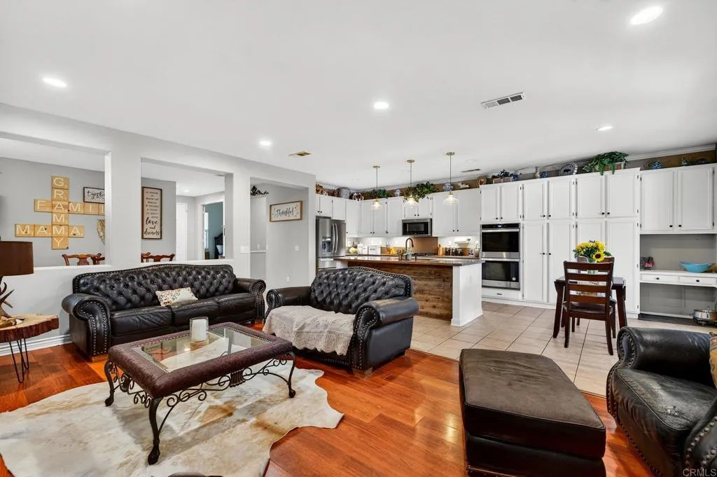 Beautifully upgraded cul-de-sac home in the highly sought-after Temecula Valley School District. This move-in ready property blends designer touches, energy efficiency, and outdoor living and relaxation at its finest. Interior features include freshly painted walls, professionally refurbished oak cabinetry with upgraded hardware, a fully remodeled kitchen and upgraded bathrooms, brand-new stainless steel matching appliances, new toilets and faucets, new light fixtures, and a new HVAC system. Reclaimed wood kitchen island, custom accent walls (reclaimed wood + faux brick), upgraded natural stone gas fireplace with concrete hearth and wood mantle, and illuminated night-light outlets throughout add warmth and character. The front office features a barn door and farmhouse corrugated metal accents ideal for a home office you will want to bring clients to. This house has major potential to fit your families needs envisioning courtyard-style French doors and space for a future bath addition for front room/guest exclusive use, makes it perfect for multigenerational living or private guest access. Backyard retreat includes stamped concrete, covered patio with natural stone columns and ceiling fans, Malibu lighting highlighting mature palm trees, in-ground gas fire pit with seating, soothing fountains, a Hot Springs spa with Frog system, mature fruit trees (Granny Smith apple, Santa Rosa plum, navel orange), drip irrigation, raised garden beds, river rock planters, privacy block wall, and space for a future pool. Additional upgrades: Solar through SunRun for energy savings, TexCote