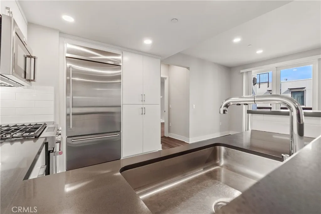 This Top-Floor End Unit residence is bright and beautifully situated, offering a pleasant view of the courtyard. The open-concept living, kitchen, and dining areas are filled with natural light, creating an inviting atmosphere perfect for both relaxation and entertaining. The sleek kitchen features quartz countertops, stainless steel appliances, a built-in refrigerator, and a spacious breakfast bar. Step outside to a private balcony overlooking the tranquil inner courtyardan ideal spot for enjoying morning coffee or unwinding in the evening. The primary suite serves as a peaceful retreat, complete with a walk-in closet and an ensuite bathroom featuring a glass-enclosed walk in shower and dual sinks. Two additional bedrooms are thoughtfully located on the opposite side of the home for added privacy. Additional amenities include an in-unit laundry area with a full-size washer and dryer, private extra storage (approximately 10' x 7'), two subterranean side-by-side parking spaces, and access to EV charging. Residents can enjoy resort-style living with access to 2 fitness centers / gyms, pools, spas, and a clubhouse, all just moments away from Concert Park, Runway Playa Vista, shopping, dining, and the beach. There are several parks and playgrounds within Playa Vista. Some photos have been virtually staged.