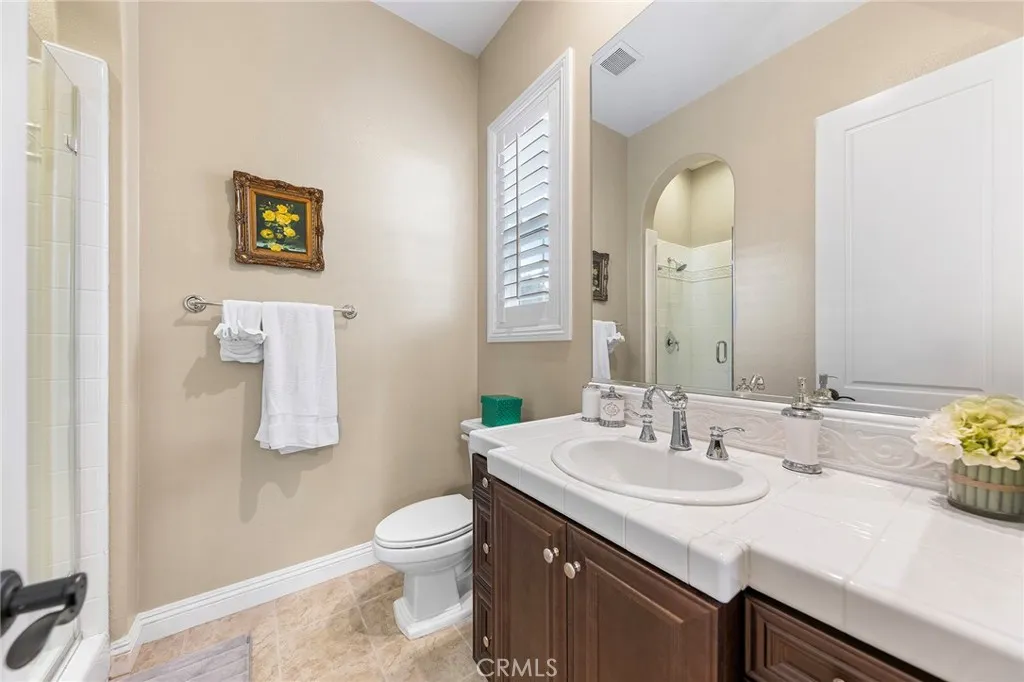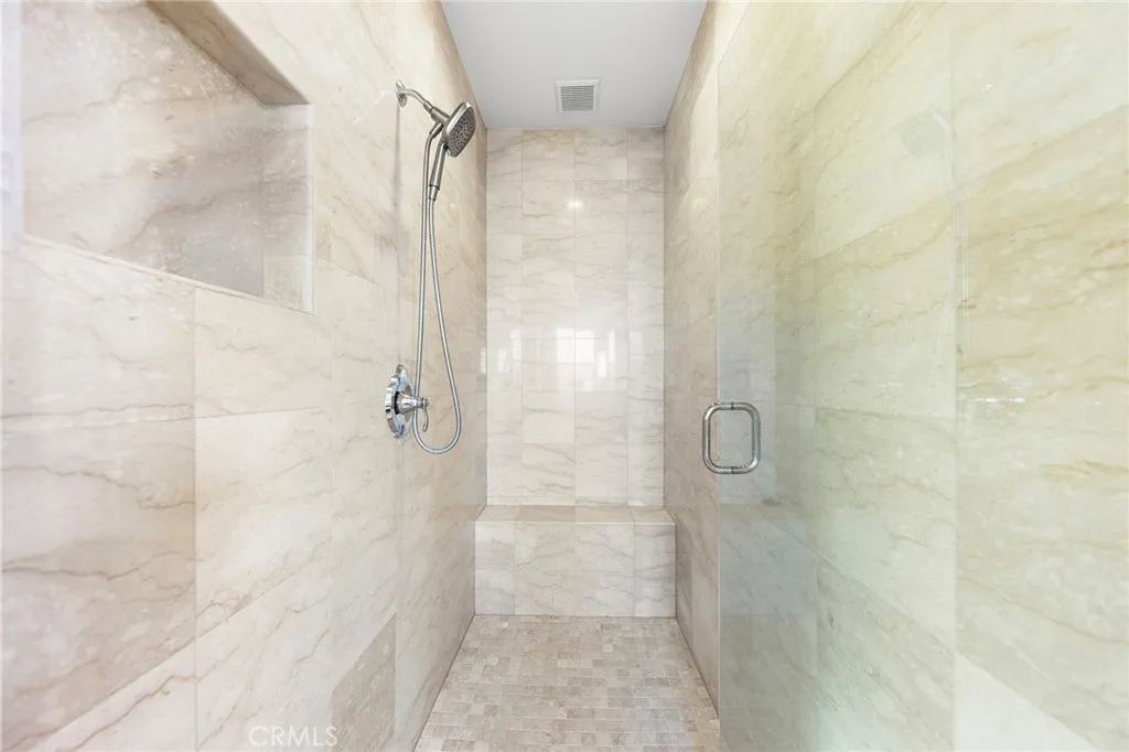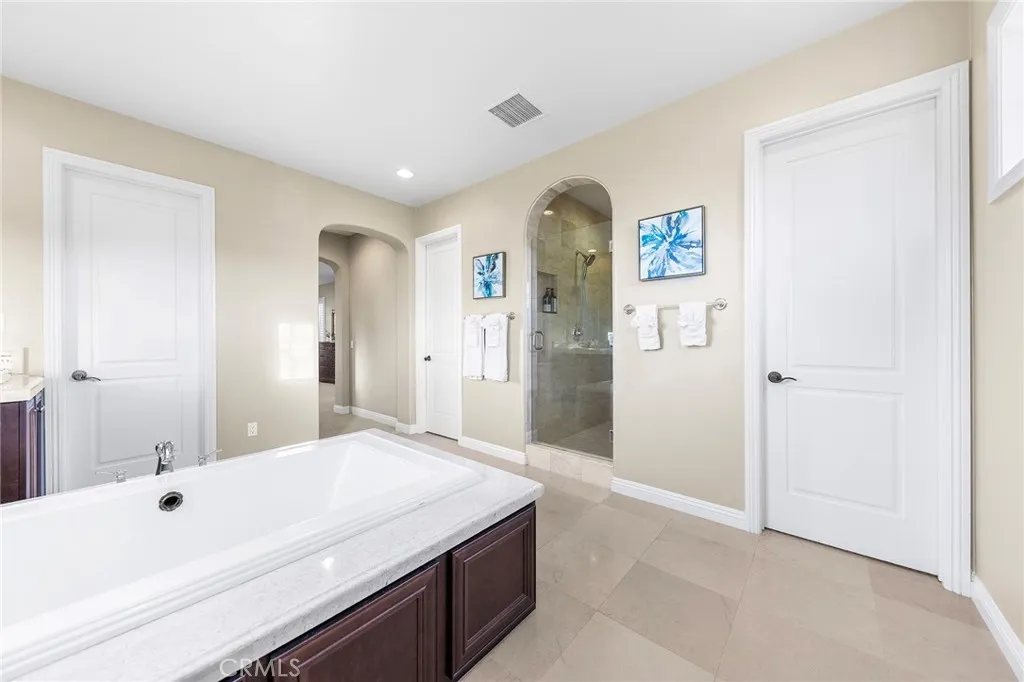 Situated in Walnuts highly sought-after Three Oaks neighborhood, this elegant Italian-inspired estate is set on an expansive 17,789-square-foot flat cul-de-sac lot and offers sweeping 180-degree views of city lights and snow-capped mountains. Spanning 4,818 square feet, the residence blends timeless architecture with refined modern comfort. A dramatic two-story foyer welcomes you inside and leads to a private first-floor office, a formal dining room ideal for entertaining, and a generous family room centered around a warm fireplace. The chefs kitchen is thoughtfully designed with top-of-the-line stainless-steel KitchenAid appliances, including a 42-inch built-in refrigerator, eight-burner range, and double ovens, complemented by a Butlers pantry and an oversized walk-in pantry. A sunny breakfast nook, powder room, and a laundry room conveniently located near the garage complete the main level. The home features five spacious en-suite bedrooms, including an impressive primary suite with its own retreat areaperfect for unwinding. Adjacent to the primary bedroom is a large upstairs loft, offering flexible space for a media room, lounge, or additional living area. Refined finishes are showcased throughout, including single and double French doors, crown molding, plantation shutters, recessed lighting, decorative glass windows, upgraded carpeting, hardwood flooring, and a purified drinking water system. Both the kitchen and bathrooms are finished with Colonial Golden Roma granite countertops, paired with custom ceramic and quartz tile backsplashes for a polished, upscale look. O