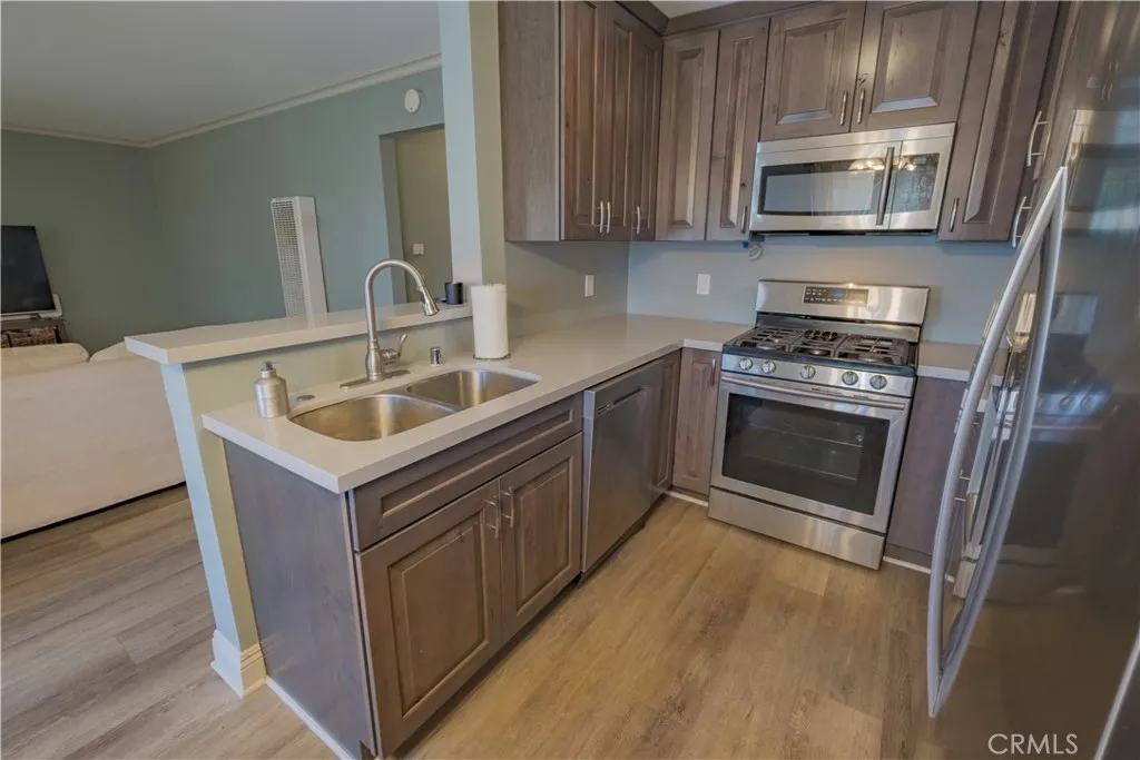 Welcome to this bright and inviting second-floor condo overlooking the sparkling community pool, located in a quiet, low-density community in desirable Whittier. Enjoy fewer neighbors, a more private living experience, and low HOA dues of just $360 per month. This beautifully remodeled 2-bedroom, 2-bath home features an open floor plan with unobstructed front-facing views and excellent natural airflow, with no buildings blocking light or breeze. The living area showcases scratch-resistant laminate wood flooring and flows seamlessly into the dining area and newly remodeled kitchen. The kitchen is thoughtfully designed with stylish updated cabinetry, ample storage, and brand-new stainless steel appliancesideal for both everyday living and entertaining. The spacious primary suite offers a walk-in closet and a private en-suite bathroom featuring an expanded, tiled walk-in shower. Across the hall, the comfortable second bedroom is perfect for guests, children, or a home office. Recent upgrades include fresh interior paint, new carpet in the primary bedroom, and a Lutron smart lighting system. Year-round comfort is ensured with a new wall furnace and wall-mounted air conditioning unit. A stackable washer and dryer are conveniently located inside the unit for added ease. Additional highlights include a detached two-car garage, providing ample parking and extra storage. Residents enjoy access to community amenities such as a sparkling pool and barbecue areasperfect for relaxing weekends and social gatherings. The home is ideally located within walking distance to highly rated schoo