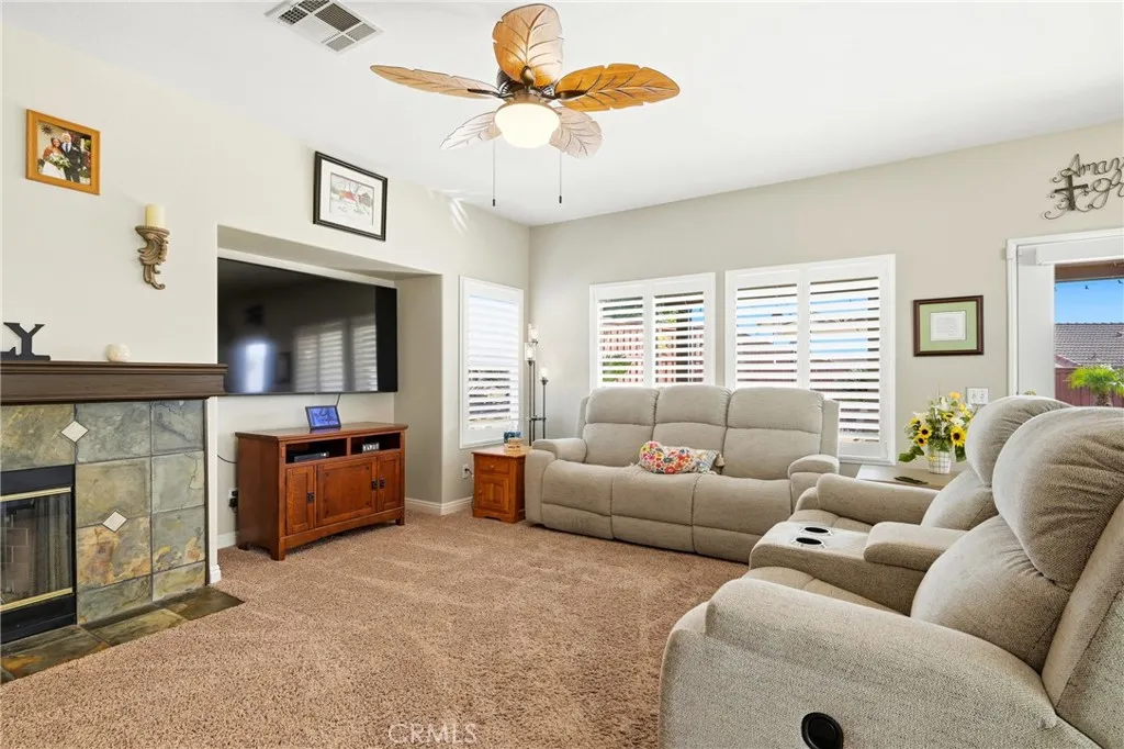 Welcome home to this beautiful 4-bedroom, 2.5-bath, 2,200 sq ft two-story residence located on a quiet cul-de-sac. Move-in ready and truly turnkey, this home offers newer paint and carpet, plantation shutters, ceiling fans throughout, and a tile roof with gutters for easy maintenance. The spacious kitchen features granite countertops, a large center island, and plenty of cabinetryperfect for everyday living and entertaining. The family room is warm and inviting with a cozy fireplace, while the upstairs individual laundry room adds everyday convenience. Retreat to the generous primary suite with a large, beautifully tiled, walk-in shower. Step outside to enjoy the beautifully landscaped 7,800 sq ft lot complete with a covered Alumawood patioideal for relaxing or hosting gatherings. RV parking on the side of the home adds valuable flexibility for toys, trailers, or extra vehicles. Additional highlights include a quiet street location, expansive backyard space, and thoughtful upgrades throughout. This is a fantastic opportunity to own a well-maintained home in a desirable settingready for you to move right in and enjoy.