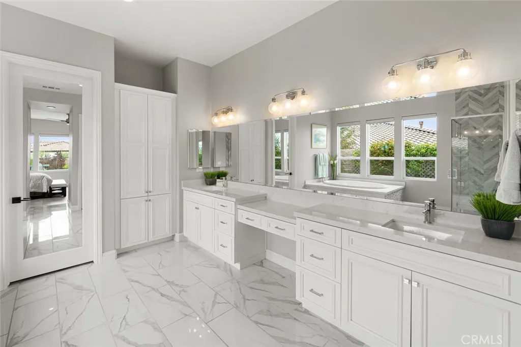 Welcome to the Carmel - this highly-sought-after model with a casita is set deep in a cul-de-sac, overlooking the vast, magnificent vineyards, offering you the very best in indoor/outdoor living. Built in 2020, at 3,005 sq. ft., this beautiful home, with modern coastal exterior, features 3 bedrooms, 3.5 bathrooms and a den. Youll love the main living area - a large living room with surround sound; a gathering area which shares a stunning dual-sided floor-to-ceiling fireplace with the adjacent music room/den; and a culinary kitchen with separate dining - its open and bright with spectacular vineyard views through the two rolling walls of glass. The upgrades are abundant - luxury engineered wood flooring, custom floating shelves around the fireplace, plantation shutters/remote shades/window treatments, ceiling fans, extra LED ceiling lights, upgraded cabinetry and quartz countertops throughout. The culinary kitchen is gorgeous with white raised-panel cabinetry, top-of-the-line GE Monogram appliances including a built-in refrigerator, 6-burner gas cooktop with upgraded stainless hood (with custom tile to the ceiling), double wall ovens, warming drawer, wine fridge, white quartz countertops, an extra long waterfall quartz island and a separate dining space with custom crystal chandelier. Outside are multiple beautifully-designed spaces: a covered patio with ceramic plank tile floor, fireplace, ceiling heater, speakers and wired for TV; a gas fire pit corner; a built-in barbecue island; and a centerpiece water feature. These separate areas are joined together by pavers, artifici
