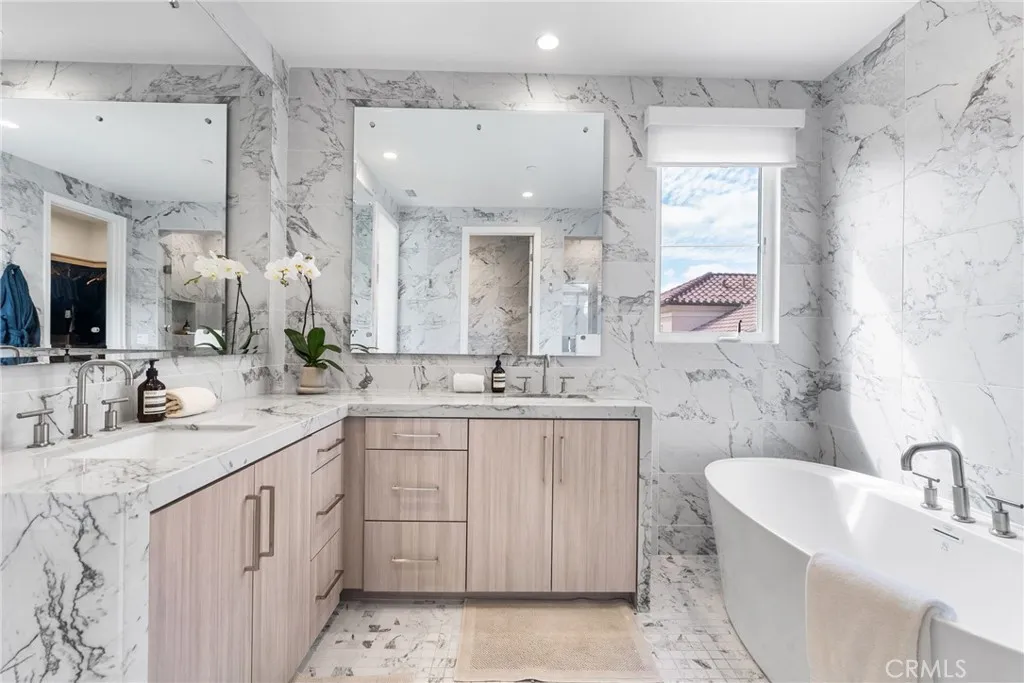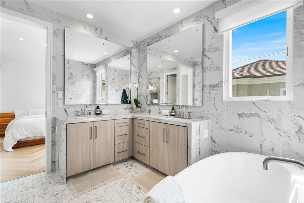 Experience sophisticated urban living in this stunning contemporary gem located in the exclusive gated community of Barcelona at Los Olivos. This meticulously maintained, unfurnished residence offers 2 spacious bedrooms, 2.5 bathrooms, and a versatile upstairs loft perfect for a home office or media retreat. Spanning 1,890 sq. ft., the open-concept floor plan is bathed in natural light, featuring high ceilings and seamless indoor-outdoor flow. The gourmet kitchen boasts high-end stainless steel appliances, premium quartz countertops, and sleek cabinetry. Retreat to the primary suite, which features a spa-like bath with a soaking tub, separate shower, and a custom-finished walk-in closet. The private backyard is an entertainers dream, finished with elegant travertine hardscape and lush, mature landscaping. Additional features include a 2-car garage with epoxy flooring and custom built-ins, laundry room, and access to world-class community amenities including a sparkling pool and manicured grounds. Located just minutes from the Irvine Spectrum Center, Great Park, and top-tier Irvine Unified schools.