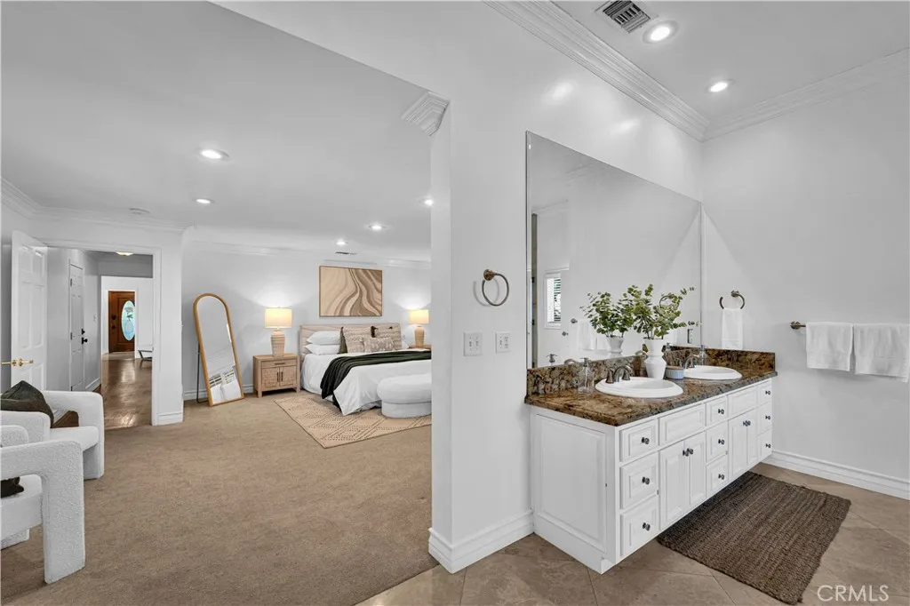 Discover this enchanting single-story, semi-custom, turnkey home which offers an abundance of space with a well-designed layout that immediately sets it apart. 2,505 sq. ft., 3 bedrooms, and 3.5 bathrooms, the home provides upgrades throughout with luxurious materials and finishes. Set on an oversized 10,910 sq. ft. lot, the property delivers generous interior living areas and a backyard designed for year-round enjoyment. The formal living room has a beamed wood ceiling, gas fireplace and windows galore to let the natural light in. The stunning kitchen features elegant granite countertops, five burner gas cooktop, sleek stainless steel appliances complemented by rich mahogany cabinetry that offers both beauty and ample storage. Adjacent to the formal dining room, the generously sized family room offers a cozy space for relaxation and direct sliding door access to backyard. At the front of the home you will find two well-appointed bedrooms, including one that serves beautifully as a secondary primary, complete with its own en suite bath. As you continue down the hall, you'll enter the grand primary suite. This beautifully remodeled spacious bedroom boasts recessed lighting, a comfortable and spacious seating area, and an extra grand doorway leading to an expansive en suite bath. The luxurious primary bath features dual sinks with elegant granite countertops, pristine white cabinetry, a separate soaking tub and shower, a water closet and a walk-in closet with a custom built in organizational system. Additional upgrades include crown molding, recessed lighting and plantation s